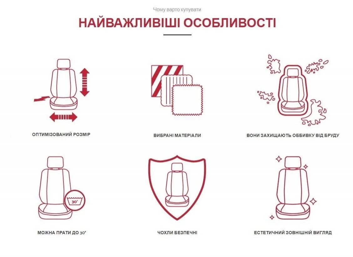 Чехлы для спинки и заднего сиденья оснащены системой молний, благодаря чему чехлы можно использовать в автомобилях как с полными, так и с разделенными сиденьями.