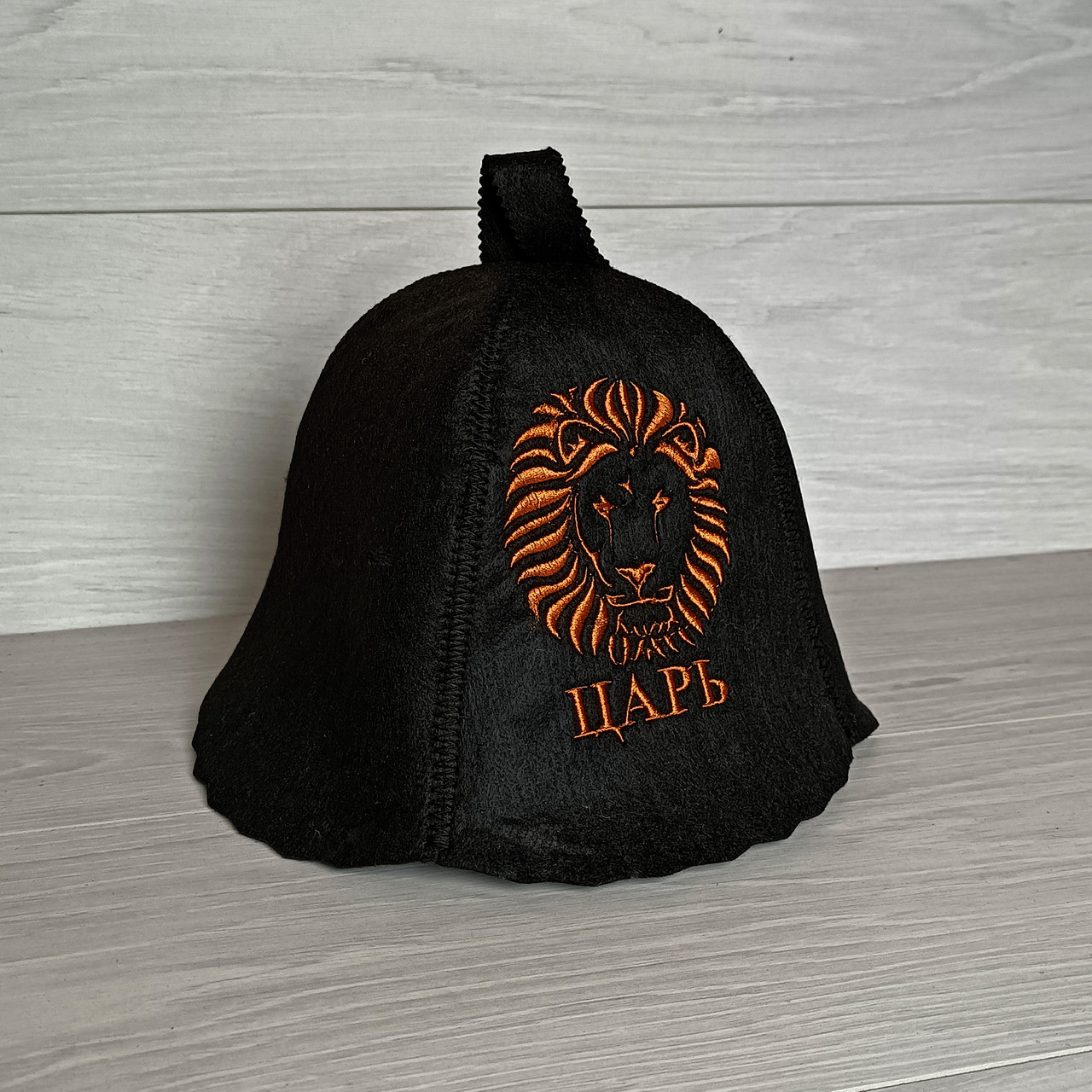 Банная шапка с вышивкой "Лев" изготовлена из искусственного фетра.