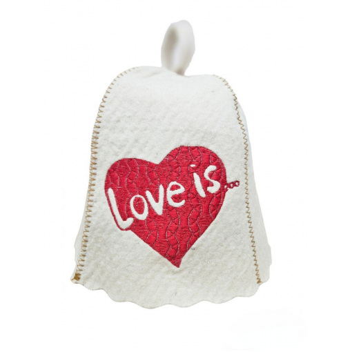 Банная шапка с вышивкой "Love is" изготовлена из натурального войлока, в составе которого овечья шерсть. Цвет белый.
