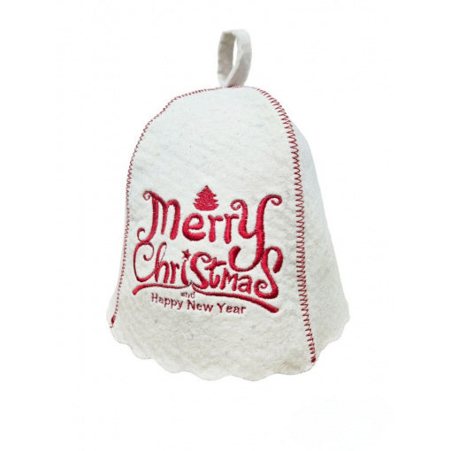 Банная шапка с вышивкой "Merry Christmas" изготовлена из натурального войлока. Цвет войлока белый.