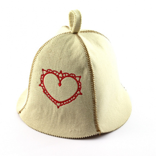 Банная шапка с вышивкой "Сердечко" изготовлена из искусственного фетра. Цвет фетра белый.