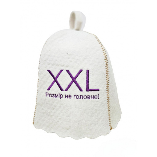 Банная шапка с вышивкой "XXL розмір не головне" изготовлена из натурального войлока, в составе которого овечья шерсть. Цвет белый.