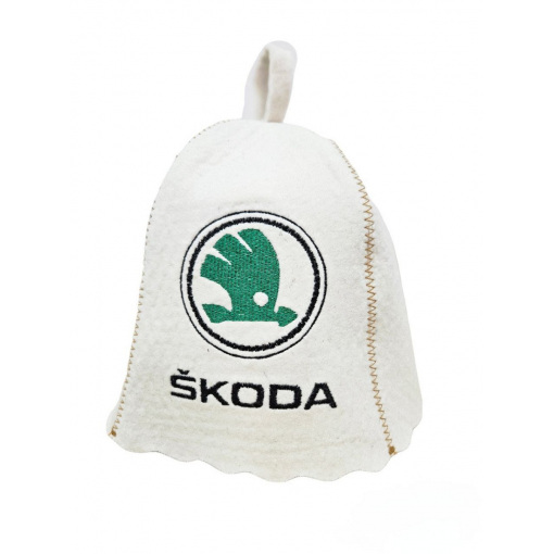 Банная шапка с вышивкой " Skoda" изготовлена из натурального войлока. Цвет войлока белый.