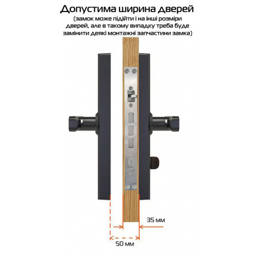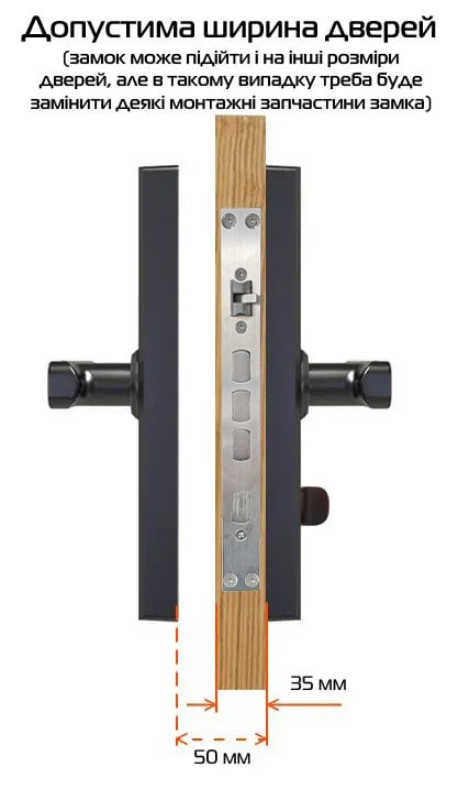 • Допустимая толщина двери: 35-50 мм (можно изменить размер при помощи замены штыря);