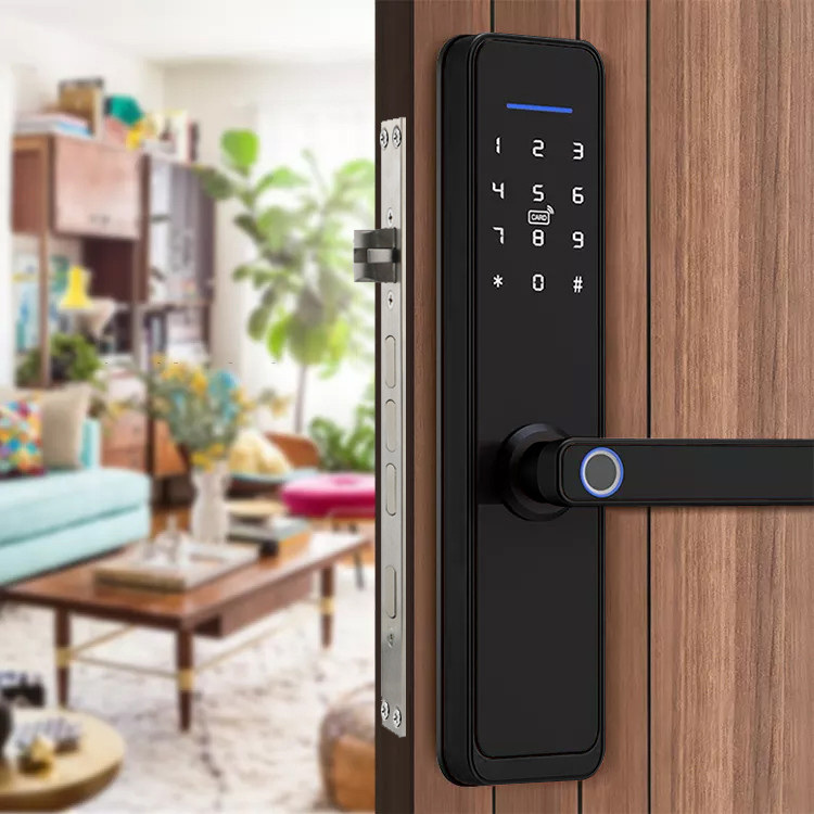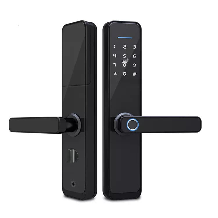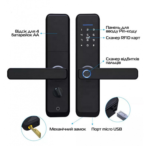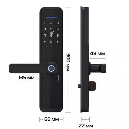 Электронный вертикальный биометрический замок с дверной ручкой. Замок отлично подойдет в качестве современной системы контроля доступа для офиса и дома. Замок универсален и прост как в монтаже, так и в использовании, для установки нужны лишь дрель и отвертка. Его можно установить, как на левосторонние, так и на правосторонние двери; на дверь, которая открывается как наружу, так и внутрь помещения. Замок отлично подойдет как для деревянной и металлической, так пластиковой и алюминиевой двери с узким профилем. Открытие замка возможно следующими способами: - с помощью ввода пароля на сенсорном экране - с помощью отпечатка пальца - с помощью удобной пластиковой карты брелока - с помощью телефона/планшета через Bluetooth соединение - с помощью обычного ключа.