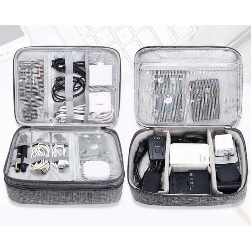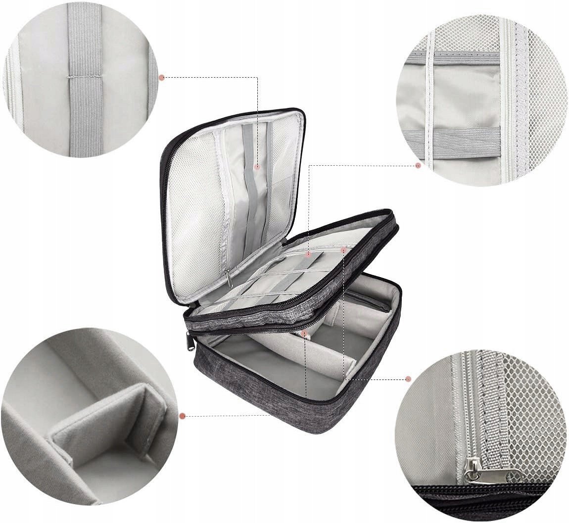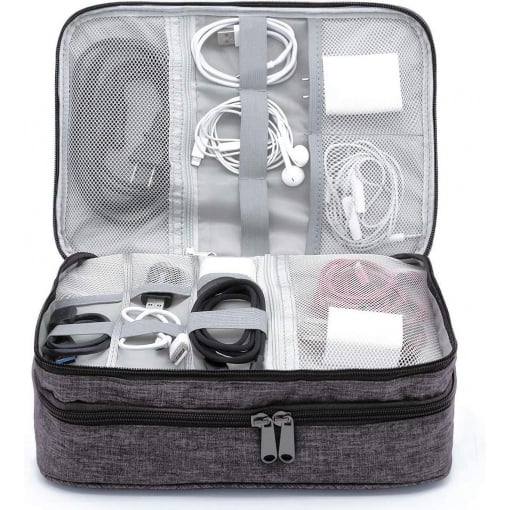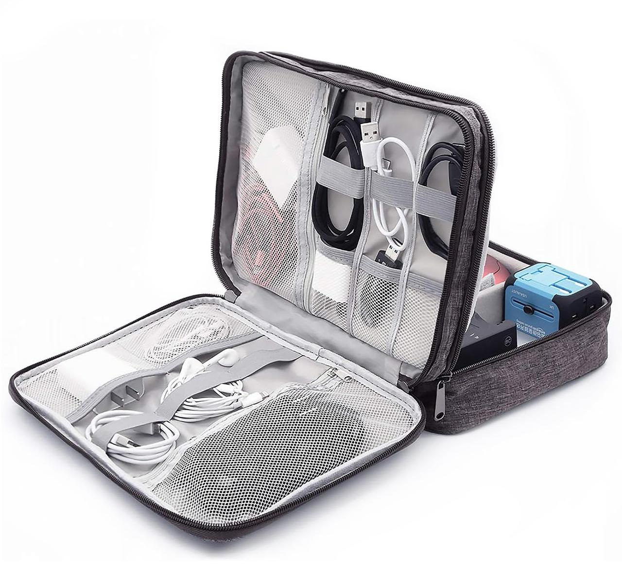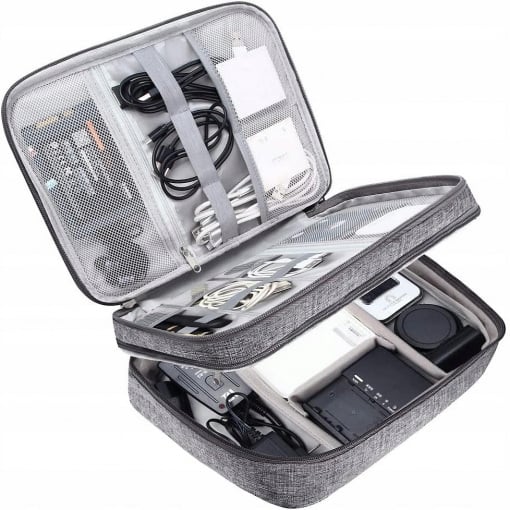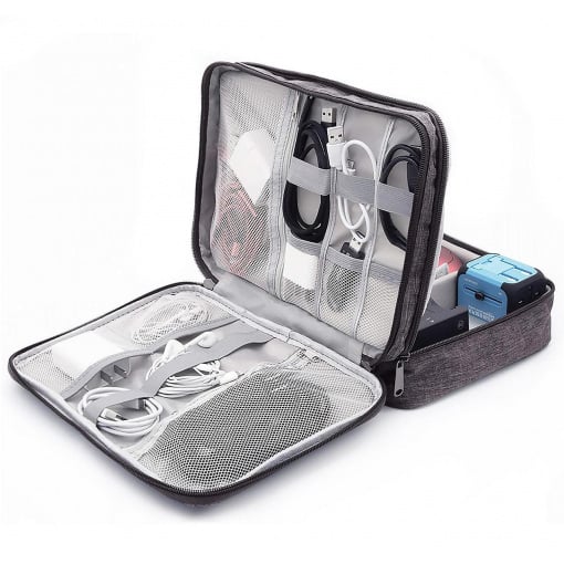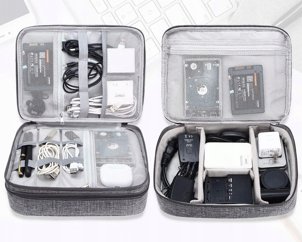 Организуйте и систематизируйте мелкую электронику в одном эстетичном футляре, который можно брать с собой куда угодно. Качественный органайзер для кабелей, проводов, карт памяти и всех других аксессуаров для электроустройств. Изделие имеет 2 больших отделения на молнии, множество отделений и петель для хранения необходимых аксессуаров. Кейс для кабелей и электроники с петлей для рук, из серого меланжевого материала, на молнии.