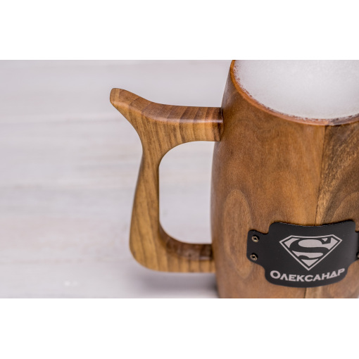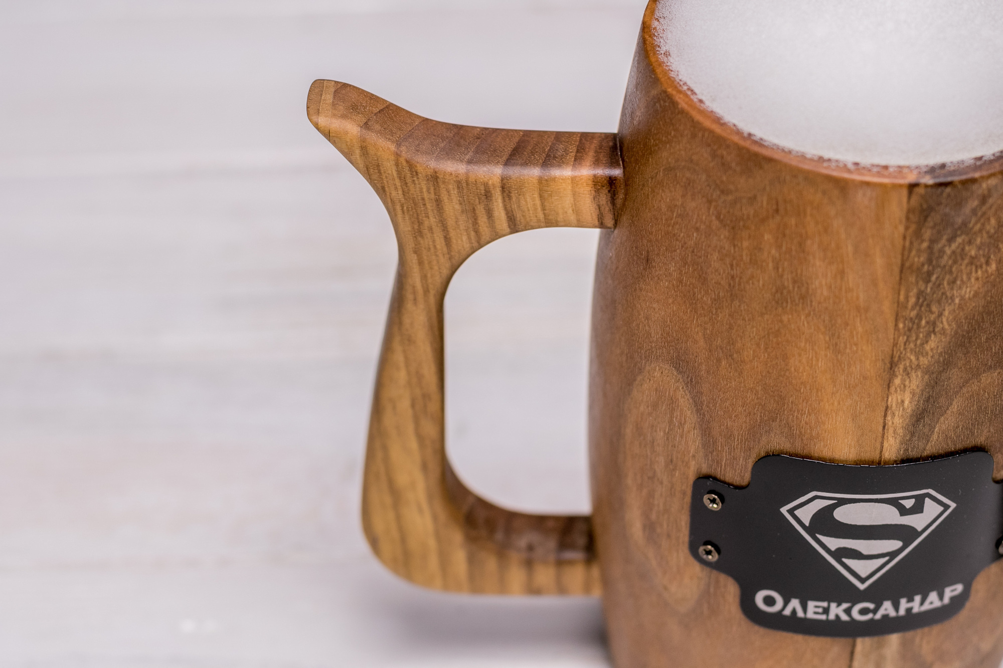 Деревянный цельный (состоит из двух половинок, ручки и дна) бокал EcoWalnut для холодных напитков с металлической бляхой. При употреблении хмельных напитков из деревянного бокала (в отличии от стеклянного) пенка не падает очень длительный период времени. Стук деревянного бокала несомненно куда более приятен и процесс распития пива превращается в веселую и легендарную затею. Кроме этого - бокал невозможно разбить.
