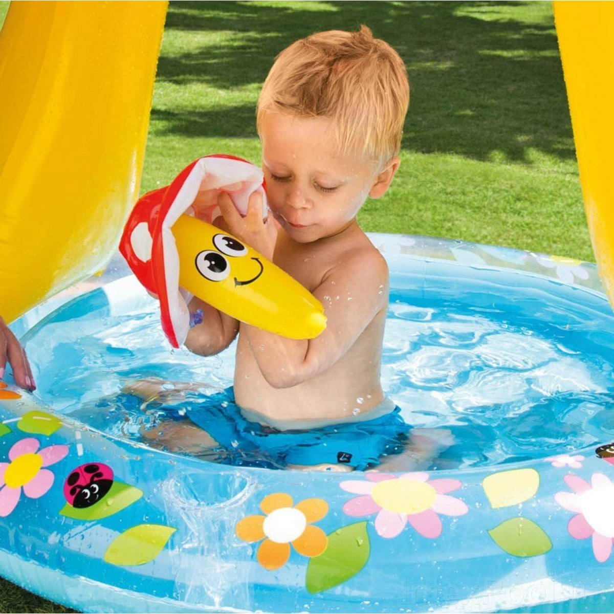 Бассейн для детей от 1 года до 3 лет. Бассейн с мягким надувным полом и встроенным надувным навесом в виде гриба мухомора. Нарисованные грибы «растут» по стенкам и бортам бассейна, а жучки и бабочки «ползают» по ножке гриба и радуют малыша. Бассейн располагает мягким дном, на котором так приятно сидится детской попке. По бортам бассейна растут симпатичные грибы-мухоморы. Навес, в виде шляпки грибка, защитит нежную кожу ребёнка от перегрева и ожогов. Яркая расцветка бассейна Intex (Интекс) способствует развитию зрения малыша.