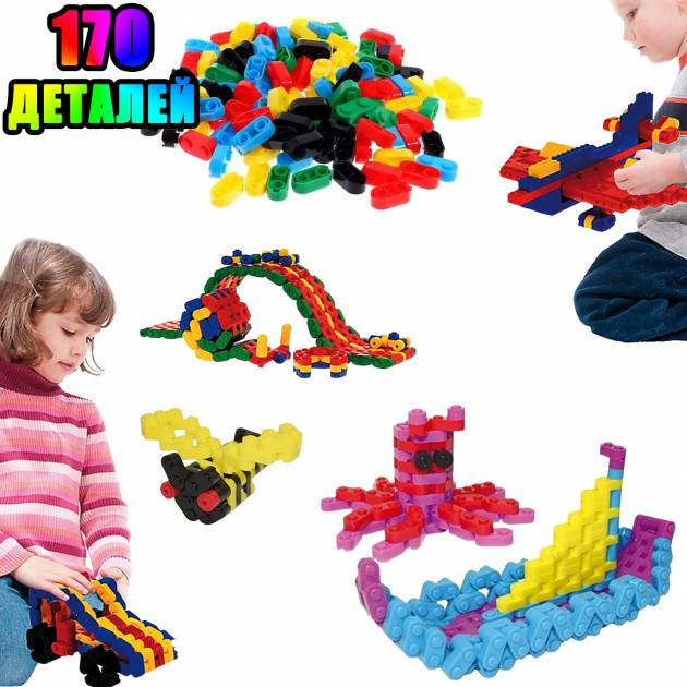 Дитячий розвиваючий конструктор 170 деталей - конструктор розвиває творчі навички, уяву, логіку, моторику та просторове 3D мислення. Він складається із 170 деталей: будівельних блоків. З конструктора можна зібрати настільки багато різних варіантів - на скільки фантазії вистачить у малюка чи батьків, вихователів, бабусь і дідусів. Маленькі діти дуже люблять конструктори, збирати яскраві деталі їм цікаво і вони можуть проводити за цим заняттям години поспіль.