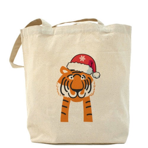 Эко-сумка шоппер с принтом Тигр в шапке Санты Кавун Бежевый