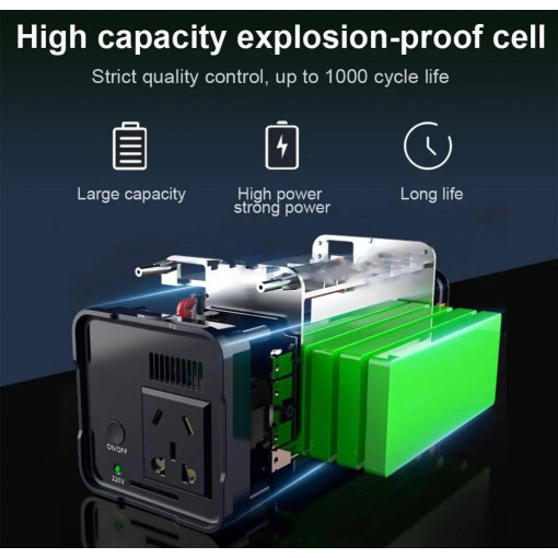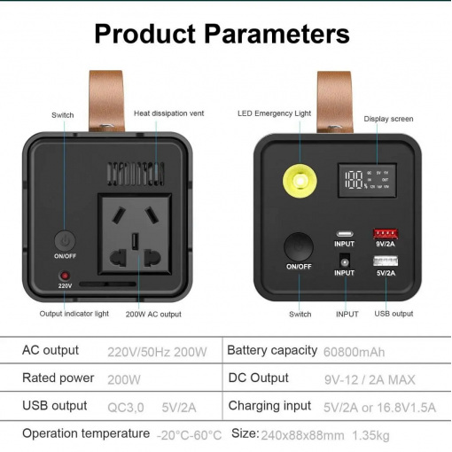Портативная зарядная станция (устройство) номинальной мощностью 200Вт. Автономный источник переменного тока 220В со встроенным литий-ионным аккумулятором емкостью 60800мА/ч.