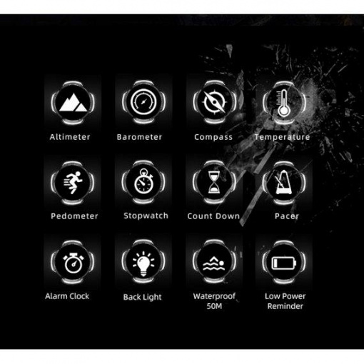 • Функції - Компас, водостійкість 5 атм, альтметр, барометр, педометр, калорії, дистанції, секундомір, підсвічування, будильник, таймер.