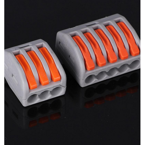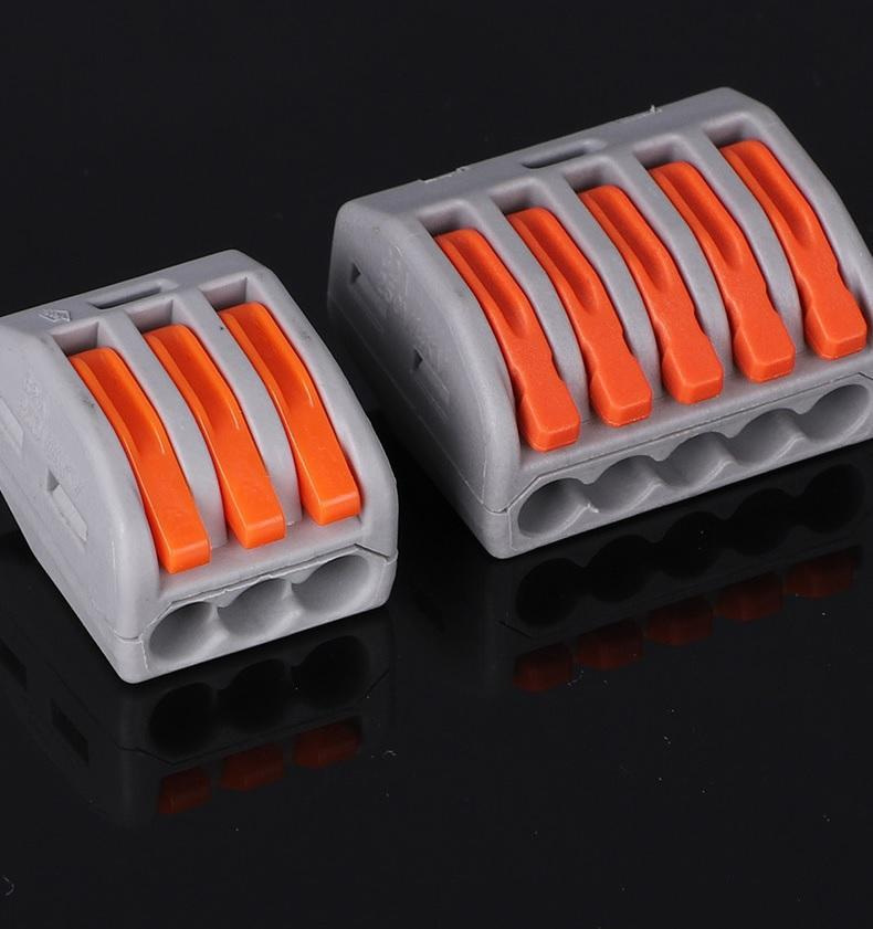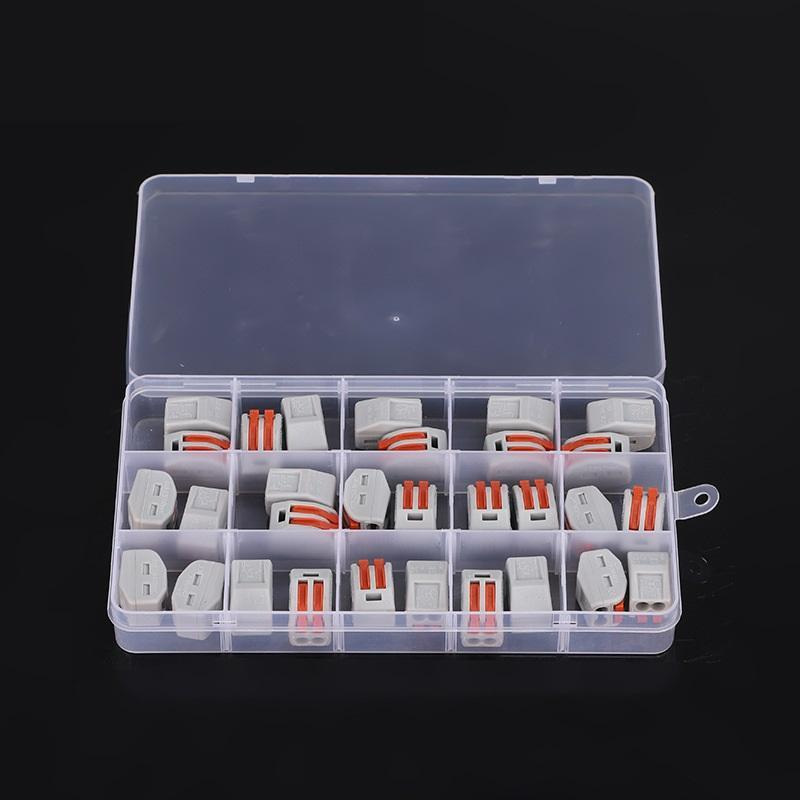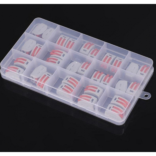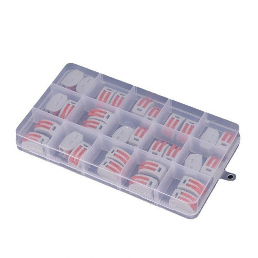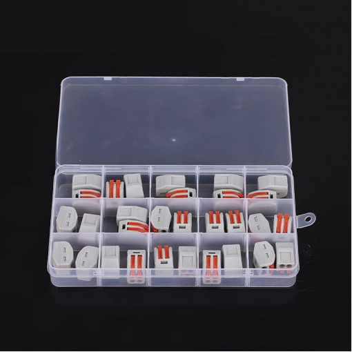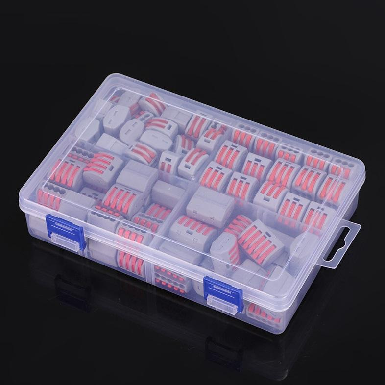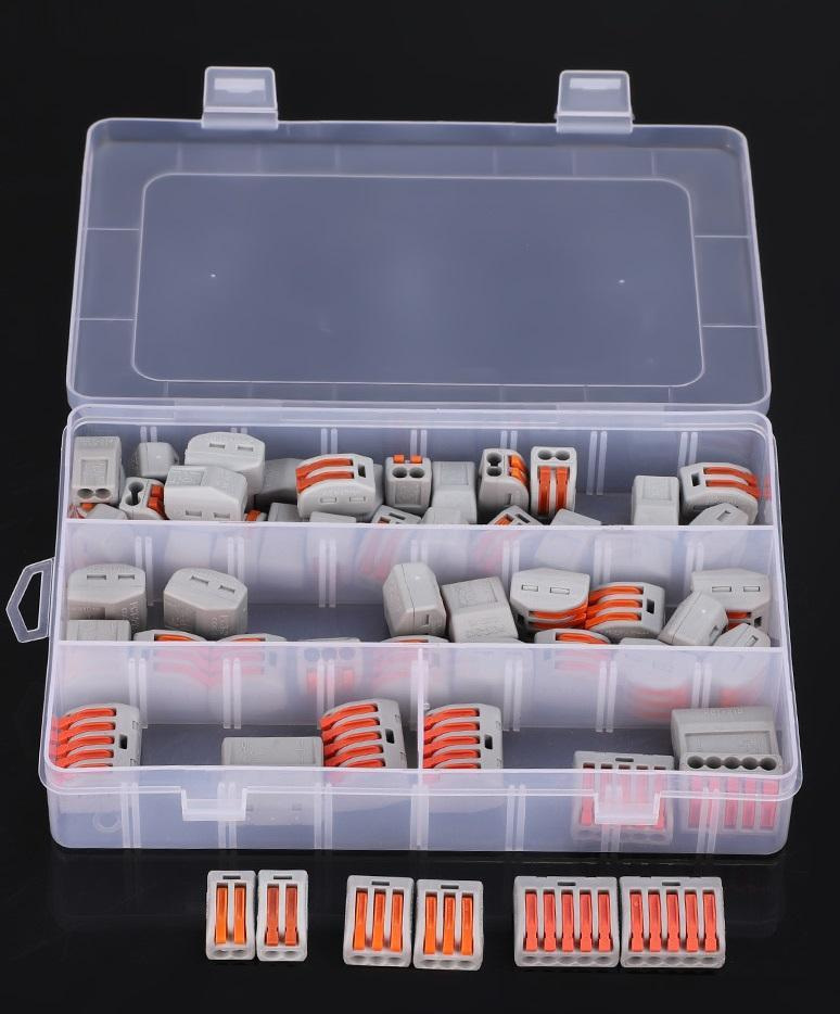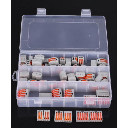 Набір клем для швидкого монтажу типу WAGO (Не є оригінальним продуктом WAGO) Клеми для швидкого з'єднання виготовлені із міцних ізоляційних матеріалів, що забезпечують захист від вогню, а також оснащені мідними контактами для стабільної електропровідності. Набір містить різні типи клем, що дозволяють виконувати широкий спектр завдань без використання паяння або додаткових інструментів. Ці ізоляційні роз'єми для електричних робіт дозволяють швидко та зручно фіксувати дроти, гарантуючи надійність та довговічність з'єднань. Якщо ви шукаєте універсальні швидкоз'єднувачі або роз'єми без паяння, цей набір стане ідеальним помічником для вашої роботи. Універсальний з'єднувач для проводів, набір клемних колодок стикового типу 60 шт + контейнер для зберігання