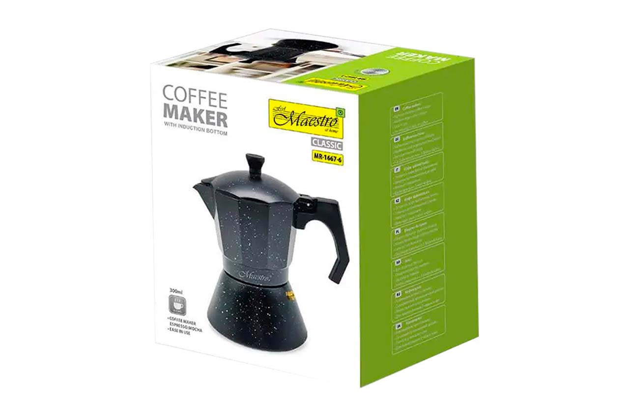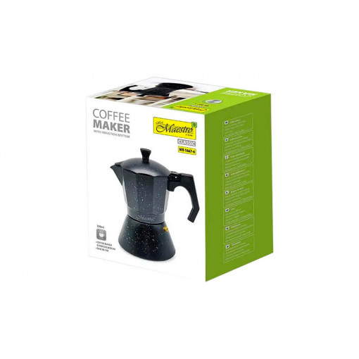 Гейзерная кофеварка Maestro MR-1667-9 предназначена для приготовления кофе как эспрессо, так и мокко. Эта модель оснащена железным диском, вплавленным в дно. Потому подходит для индукционных плит. Рассчитана на 9 чашек кофе.