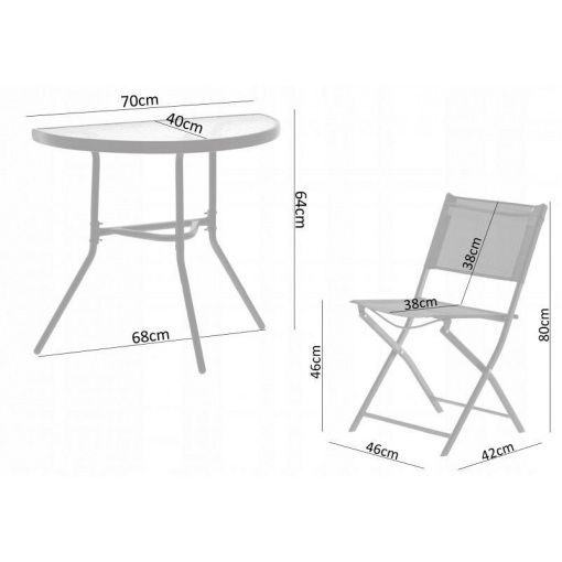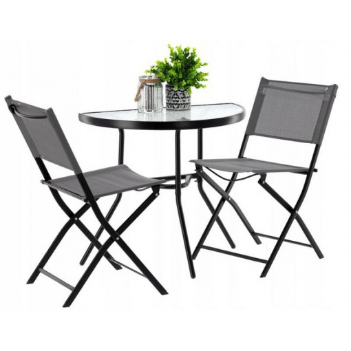 Практичный набор для балкона, террасы или сада. Каркас стула и стола изготовлен из металла, верхняя часть – из закаленного стекла, а сиденья и спинка кресла изготовлены из прочной и практичной ткани TEXTELINE.
