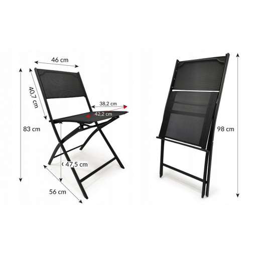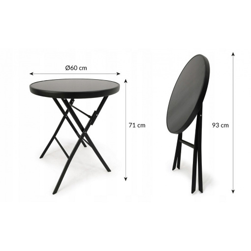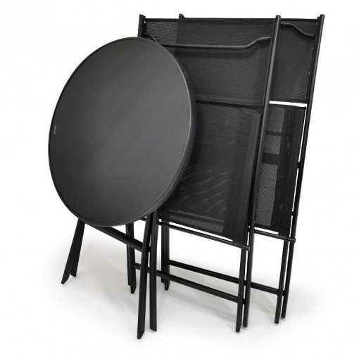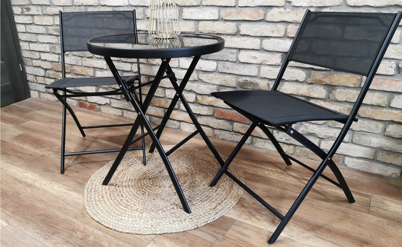Практичный набор для балкона, террасы или сада. Каркас стула и стола изготовлен из металла, верхняя часть – из закаленного стекла, а сиденья и спинка кресла изготовлены из прочной и практичной ткани TEXTELINE.