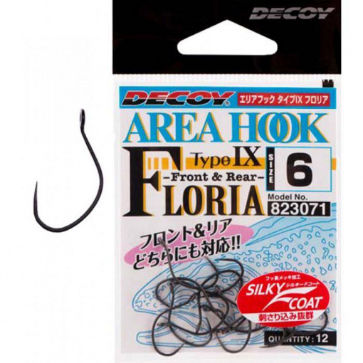 Decoy AH-IX FLORIA - серия форелевых безбородых крючков. Особенностью данной модели является то, что изгиб ушка и жало находятся в одной плоскости. Это повышает шансы на результативную поклевку, но удержание трофеев на крючке меньше, поскольку жало крючка не смотрит во внутреннюю сторону. Данная серия имеет тефлоновое покрытие, которое значительно упрощает проникновение крючка в пасть рыбы.