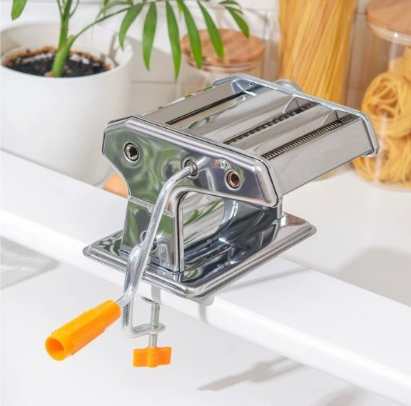 Настольная механическая лапшерезка идеально раскатывает тесто для лапши, пельменей, вареников, чебуреков, равиоли и других изделий.
