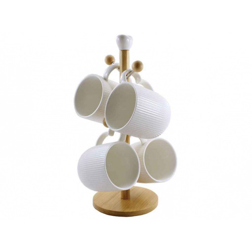 Набор фарфоровых кружек на деревянной стойке хорошего качества станет отличным выбором для домашнего уюта или в качестве подарка.