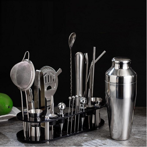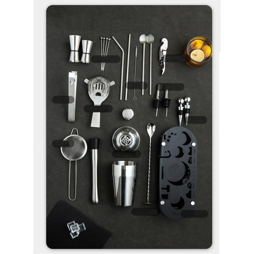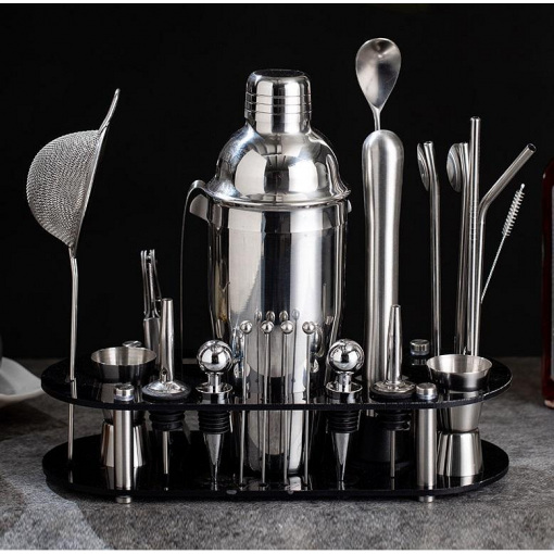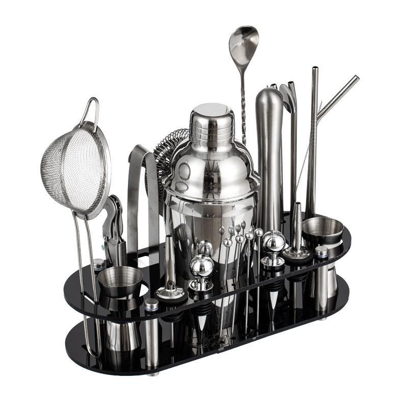 Набор для бара 23 в 1 для приготовления коктейлей изготовлен из высококачественной нержавеющей стали и имеет подставку
