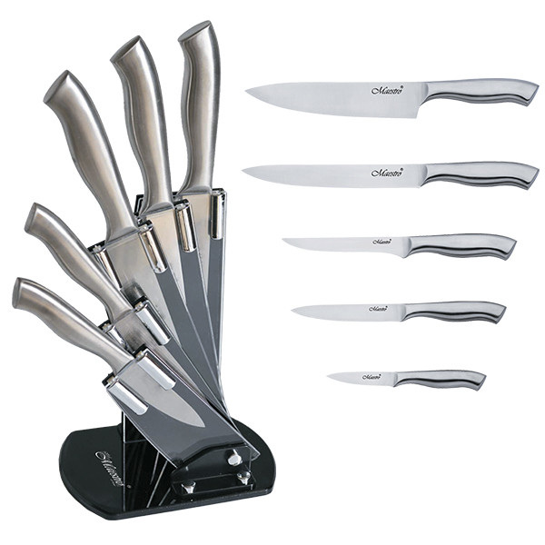 Наборы ножей от Maestro призваны облегчить вашу каждодневную работу на кухне. Без хорошего ножа не обойтись, если необходимо очистить и нарезать рыбу, приготовить салат или мясо. Maestro MR1410 состоит из 6-ти предметов — пять ножей различного назначения из нержавеющей стали, которые станут идеальным вариантом для нарезания разнообразных продуктов на вашей кухне, а также акриловой подставки для удобства хранения.