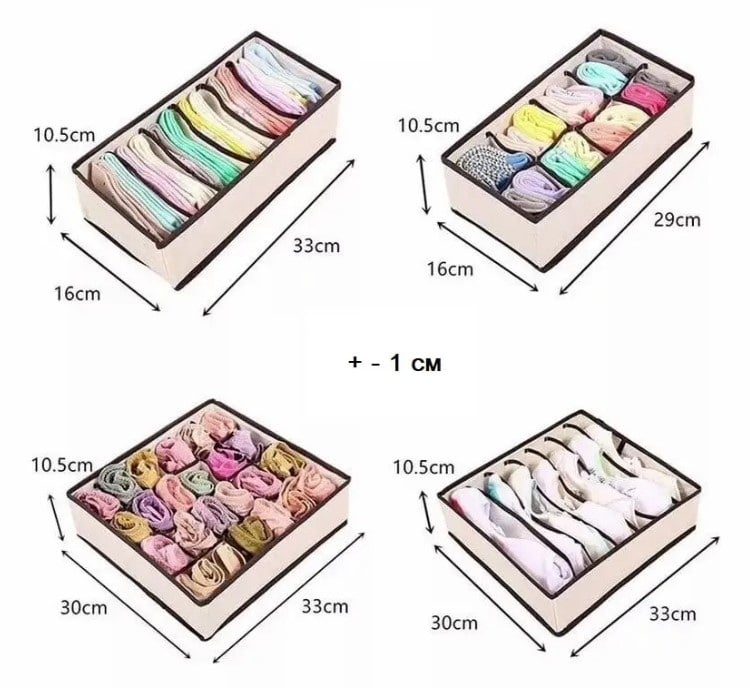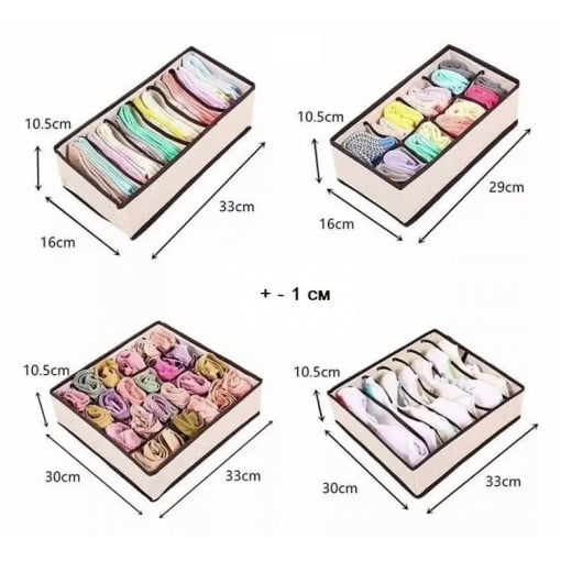Набор органайзеров для ящиков гардероба, каждый из которых имеет внутренние перегородки, 6 отделений (для шарфов, галстуков), ящик с 7 отделениями (для бюстгальтеров), ящик с 8 отделениями (для нижнего белья, трусов, галстуков) и ящик с 24 отделениями (для носки). Обеспечивает порядок в хранении вашей одежды и позволяет быстро найти то, что вам нужно. Нетканый материал: система органайзеров для ящиков изготовлена из высококачественного нетканого материала мягкий и без запаха. Поможет избежать плесени и отвечает вашим требованиям к долгосрочному хранению. Простой уход – протрите влажной тряпкой и дайте высохнуть на воздухе. Многофункциональный дизайн: ящик для хранения нижнего белья можно сложить в плоскую форму для удобного хранения, когда он не используется. органайзеры для белья — идеальный выбор для экономии места в ящиках, шкафах, шкафах для одежды и шкафах для тортов. Простота в использовании: ящикы-органайзеры с функцией складывания можно разложить, хранить и складывать. и удобно брать с собой в путешествие.Универсальный набор органайзеров для хранения предметов нижнего белья, бюстгальтеров, носков и других мелких аксессуаров. Все вещи можно разделить в удобном для вас порядке – по цвету, бренду и т.д. В комплект входит четыре органайзера. Набор органайзеров для нижнего белья позволит Вам сэкономить пространство в гардеробном шкафу. Характеристики: Материал: нетканый материал; Размеры: 34х16х10 см (6 ячеек); 31.5х32х10 см (7 ячеек); 28.5х14.5х10 см (8 ячеек); 31.5х32х10 см (24 ячейки).