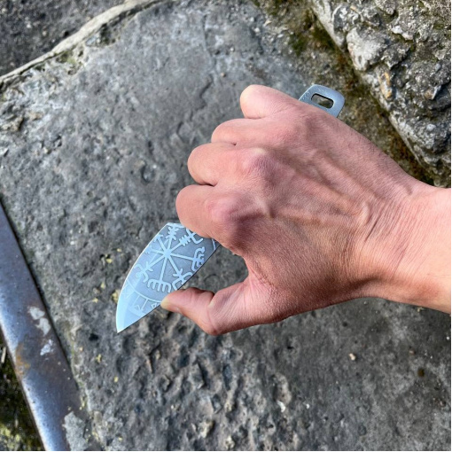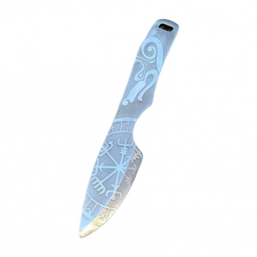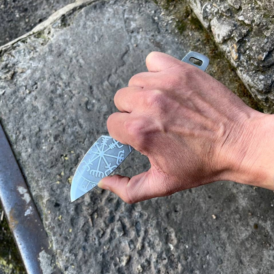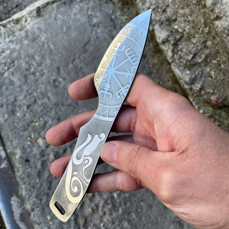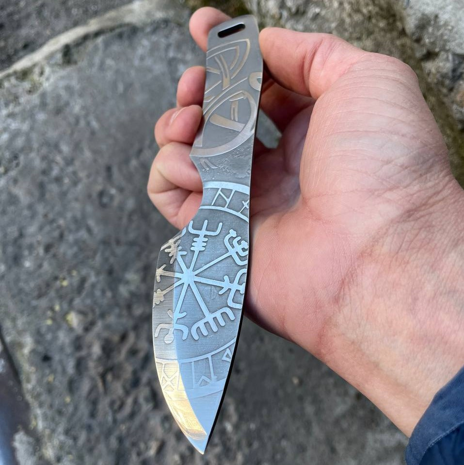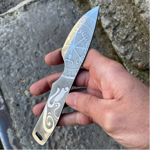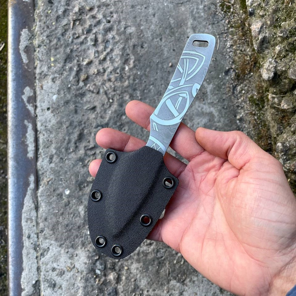 Полноразмерный нож как для ежедневного ношения так и для туристических походов, бушкрафта и лесных приключений. Конструкция ножа “Фулл Танг”. Нож имеет средние размеры. Он обладает большой прочностью и может выдерживать значительные нагрузки за счет толщины обуха и конструкции. Ножом легко выполнять лагерные работы, колоть небольшие поленья, резать ветви. Лезвие ножа сделано из нержавеющей стали 50х14мф, закаленное в 57-58 HRC и хорошо заточено. Имеет ушко. Рукоятку можно дополнительно обматывать кожей или паракордом для дополнительного комфорта при использовании. Также данную модель ножа можно легко и быстро кастомизировать. На клинке вытравлены узоры.