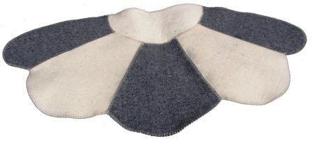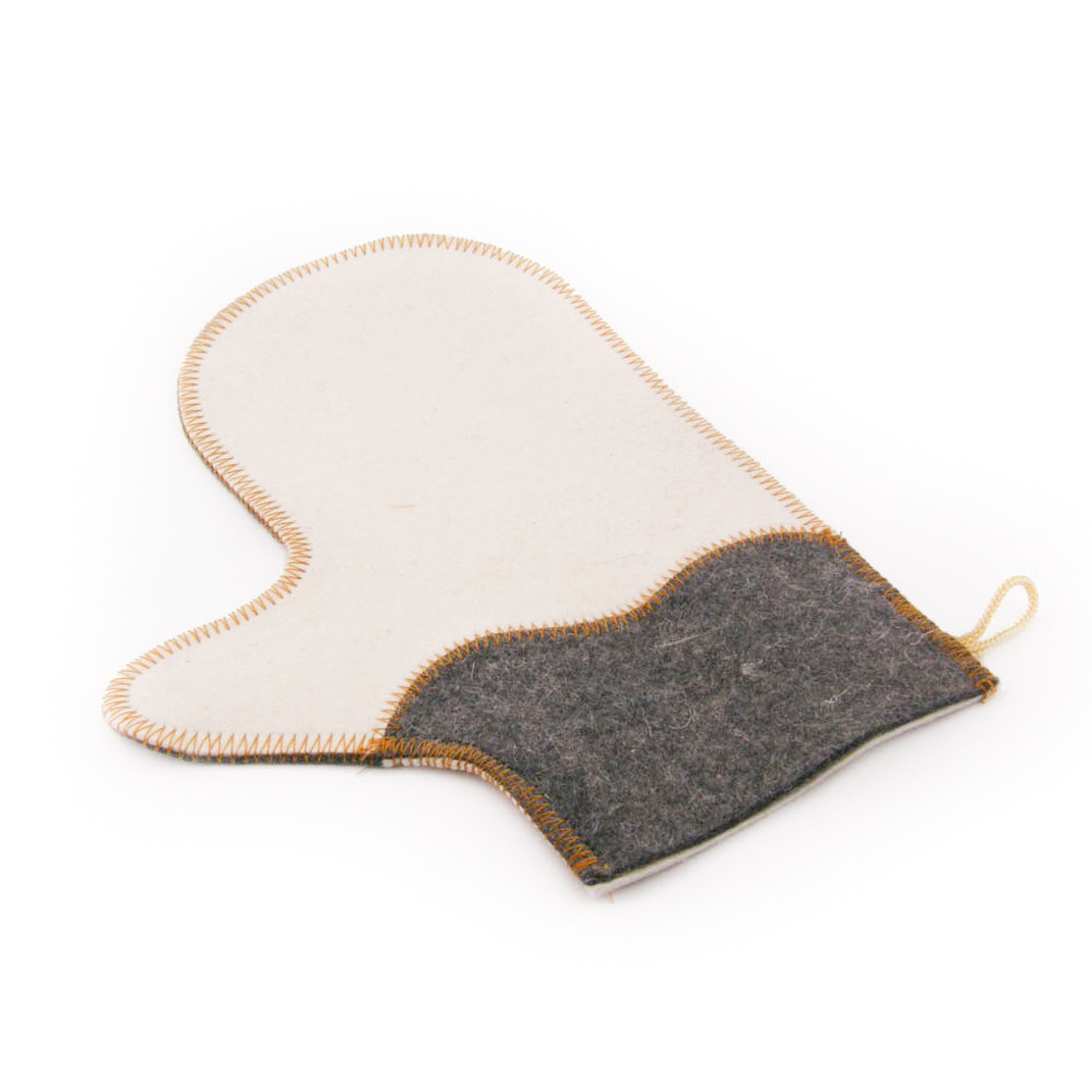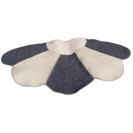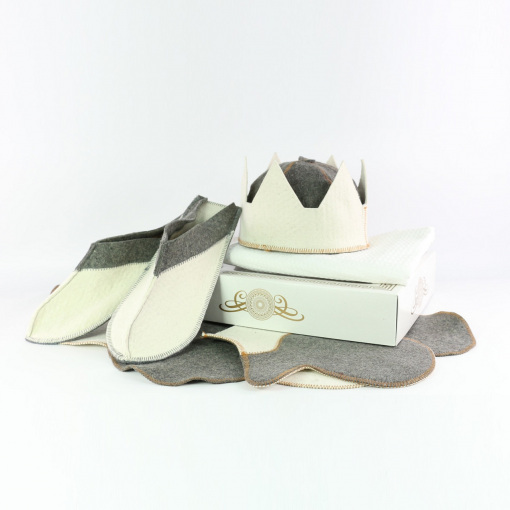 Шапка, рукавичка, коврик и тапочки изготовлены из натурального войлока – идеального материала для банных процедур. Он обладает низкой теплопроводностью (не нагревается даже при высоких температурах), влагоустойчив, легко чистится.
