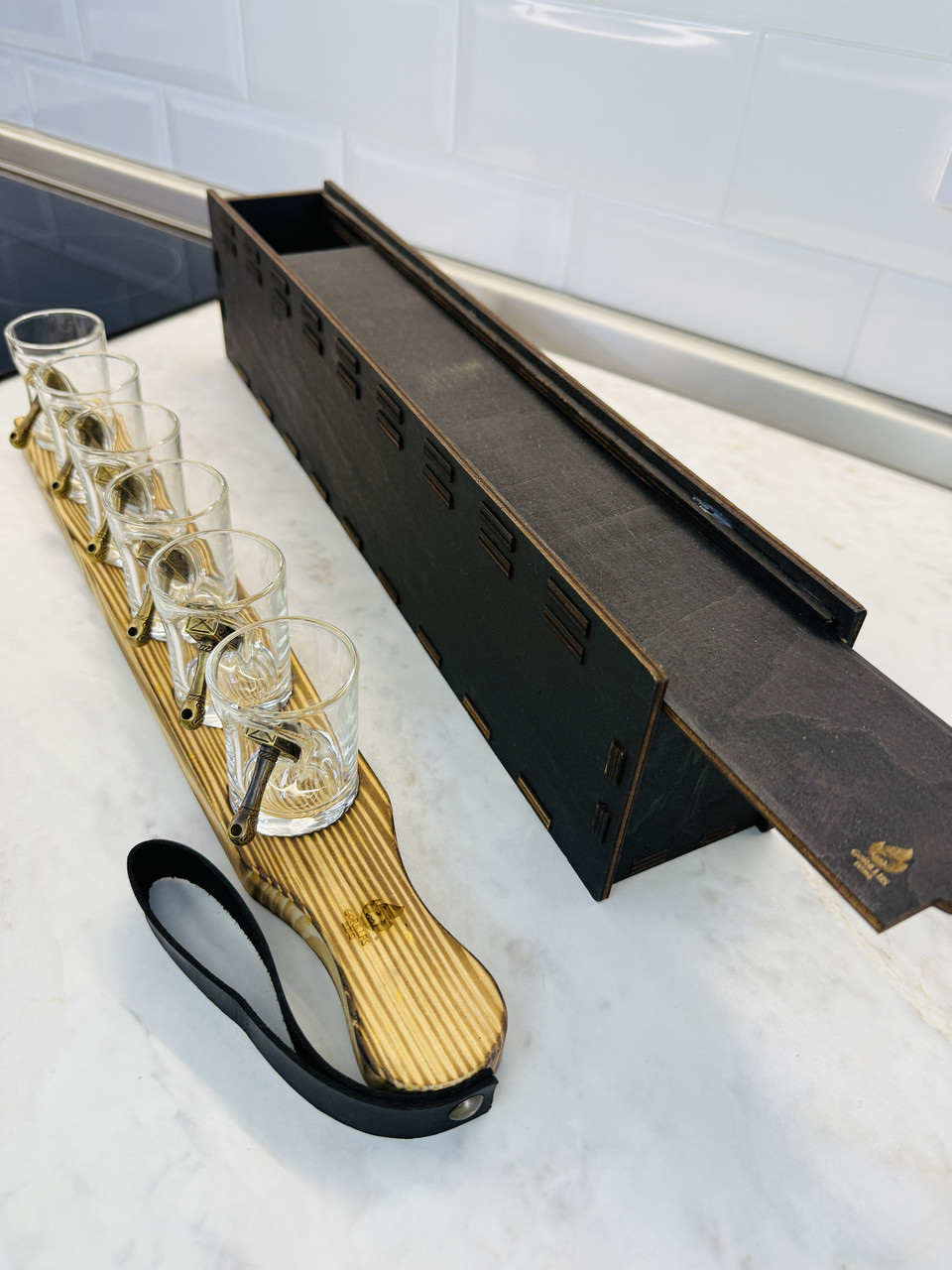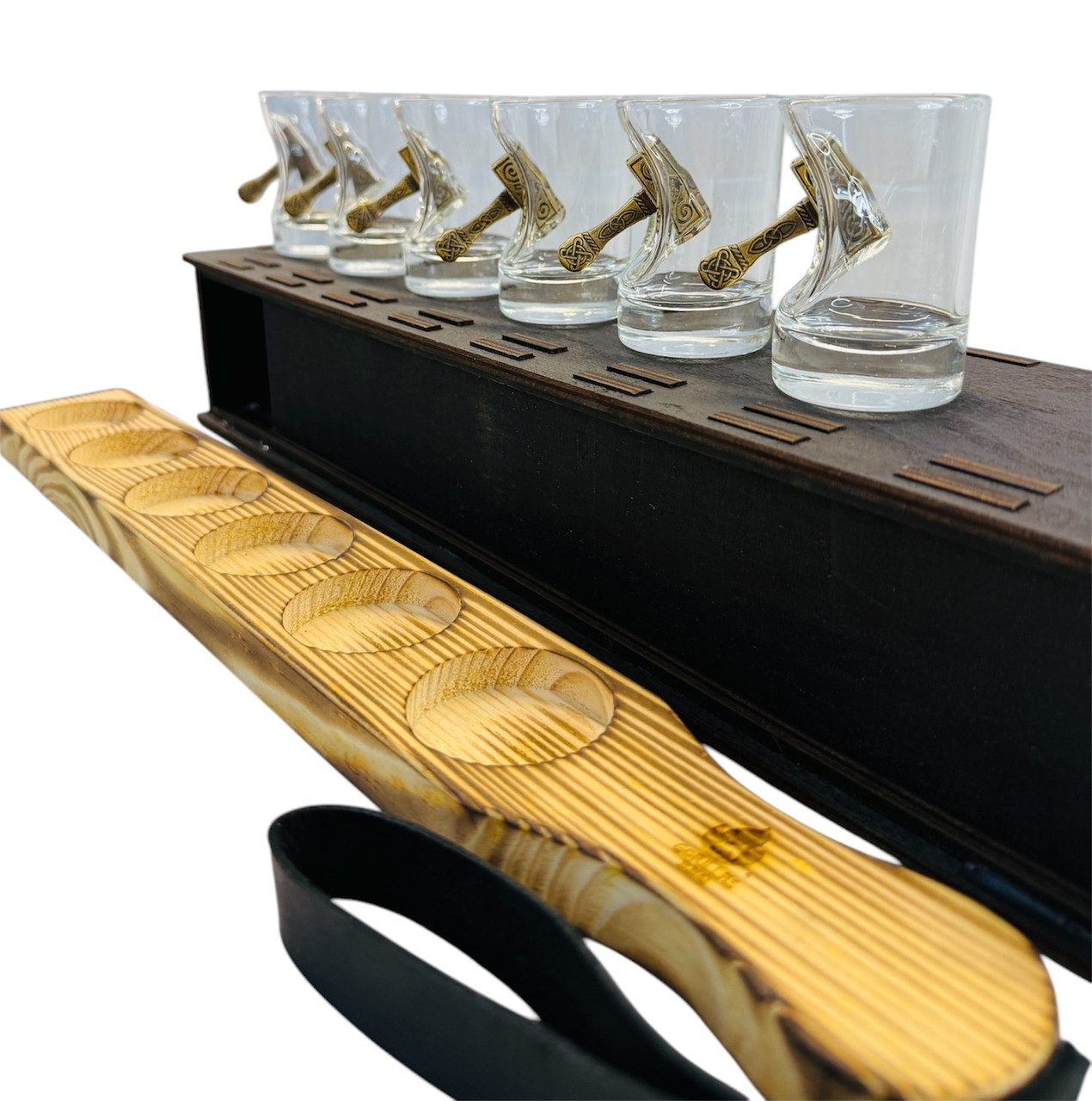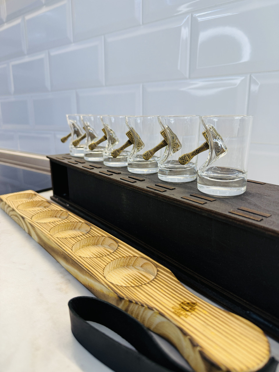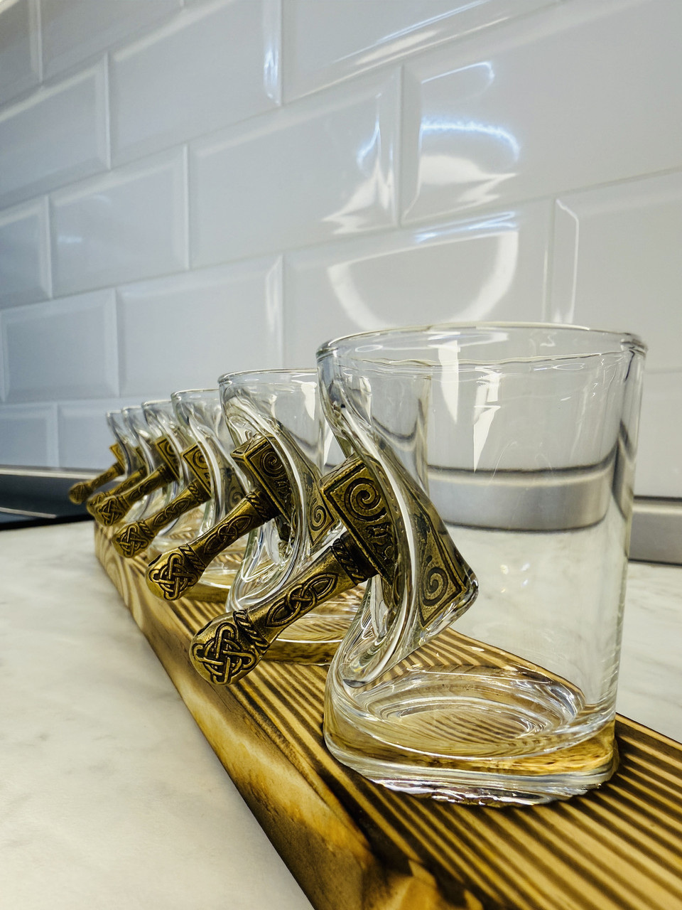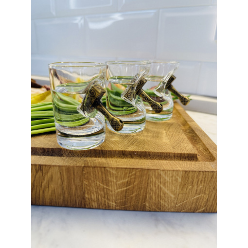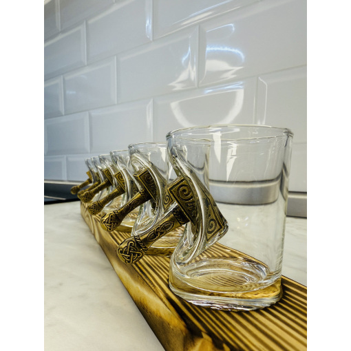 Главная особенность изделия — декоративный молот, словно врезавшийся в стекло и застрявший в нем. Молот напоминает знаменитое оружие скандинавского бога Тора — Мьёльнир, что придаёт рюмке особый харизматичный вид и символизм силы и могущества.