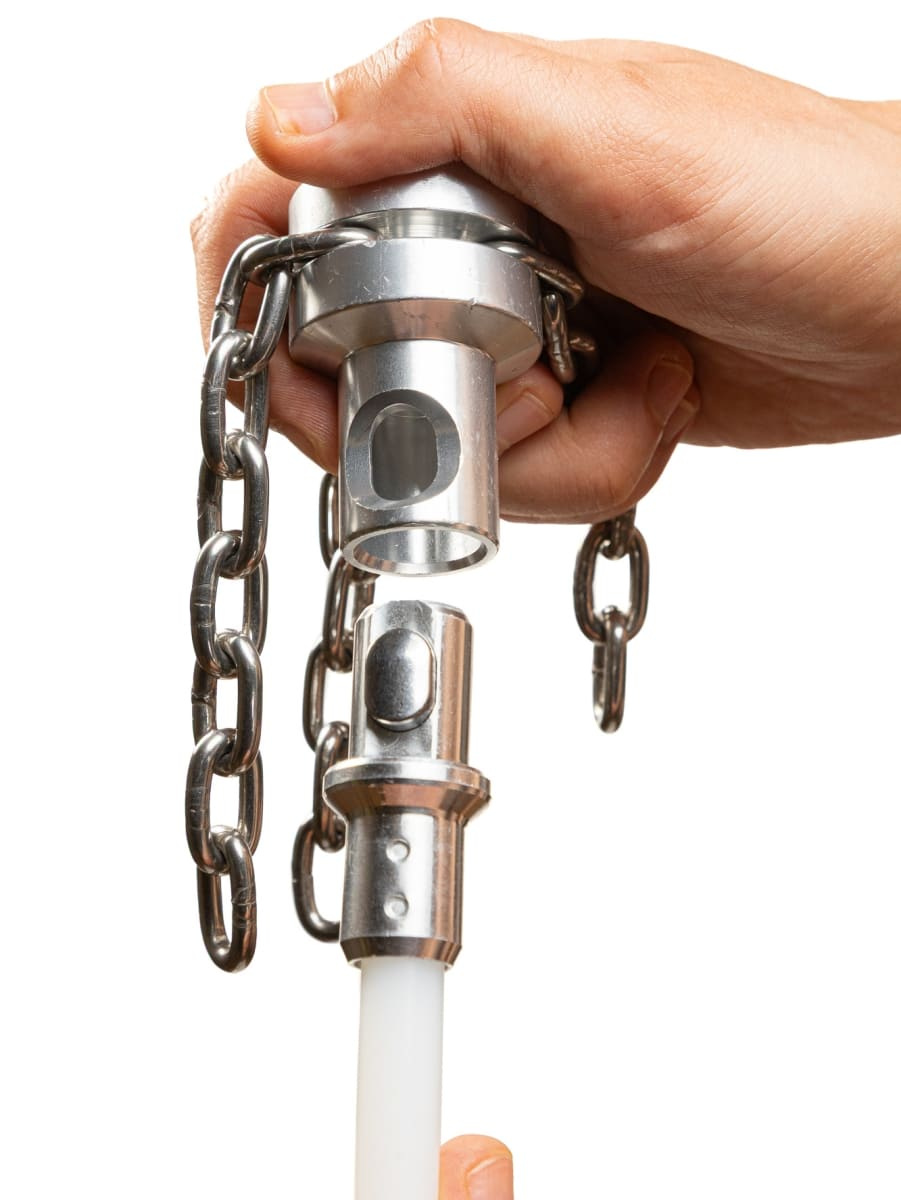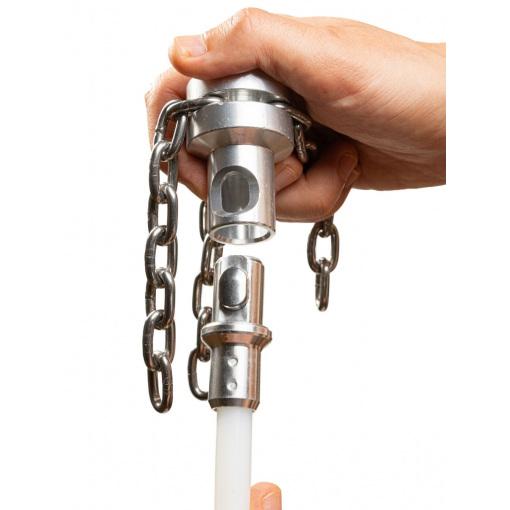 Щетка фиксируется с помощью быстроразъемного механизма к гибким нейлоновым ручкам, которые оборудованы удобным замком для пальцев. Это позволяет легко очищать каналы с изгибами до 90 градусов. Щетка подходит для очистки дымоходов разной формы – круглой, овальной, квадратной или прямоугольной – с диаметром от 100 до 250 мм.