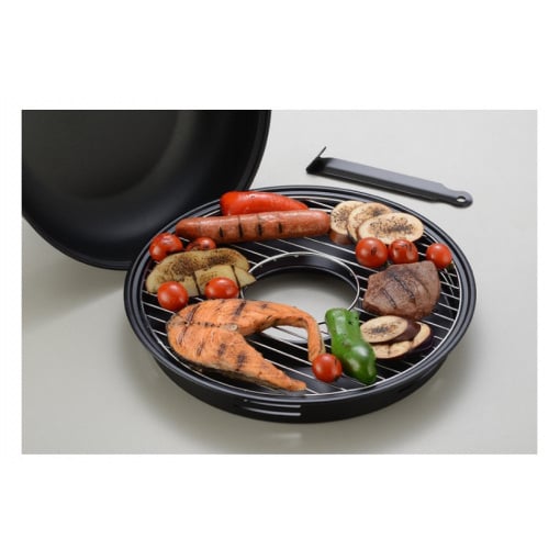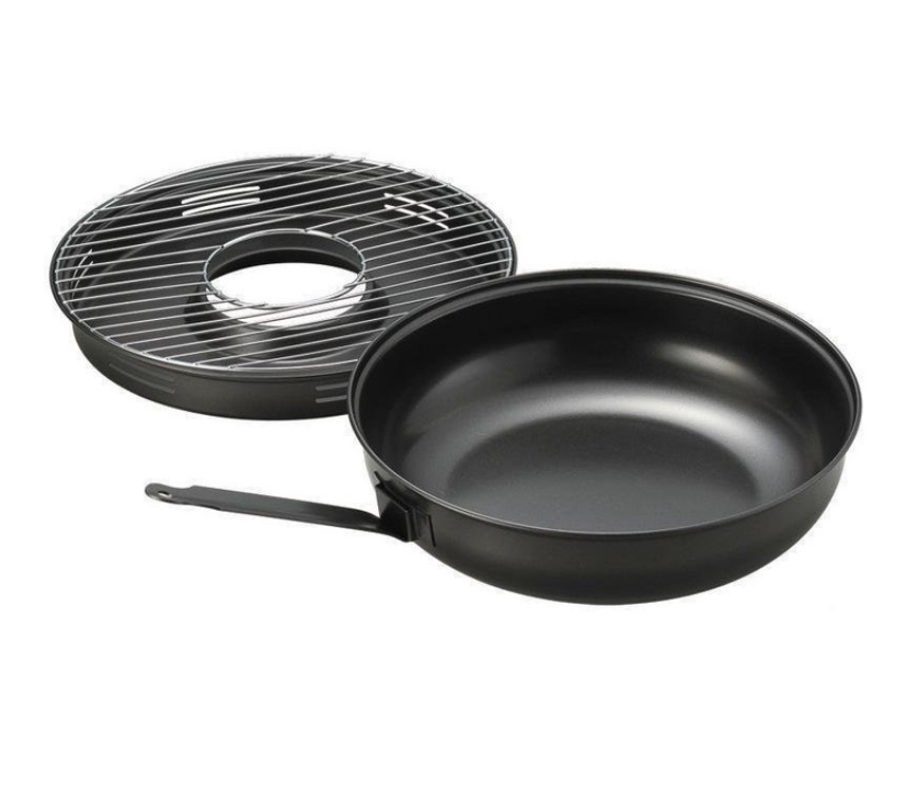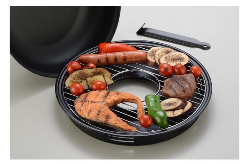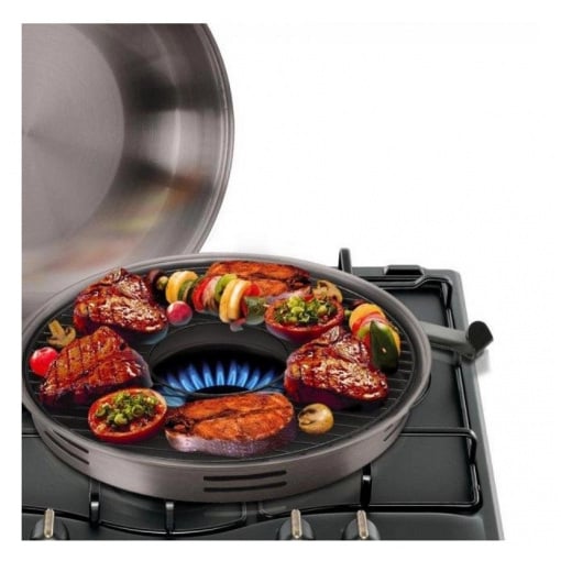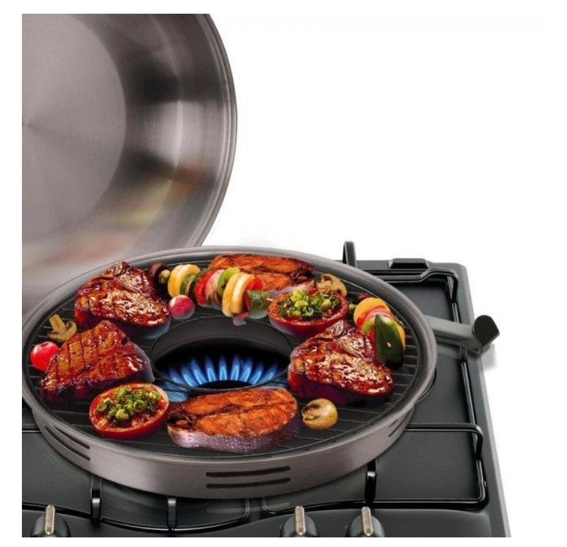 Поток горячего воздуха проходит через центральное отверстие и отражаясь от крышки обдувает пищу, выходя через боковые отверстия. Благодаря тому отсутствию прямого контакта огня и продуктов, отпадает необходимость использовать масло или жир для приготовления ваших любимых блюд. При этом сохраняется вкус и сочность, а также полезные свойства продуктов. Теперь погода не сможет помешать вам приготовить ваш любимый шашлык и другие блюда на гриле в любую погоду у вас дома. А еще сковороду гриль-газ можно использовать для приготовления выпечки.