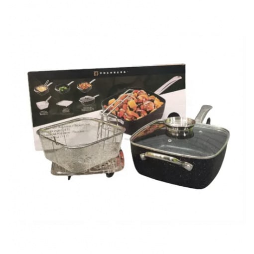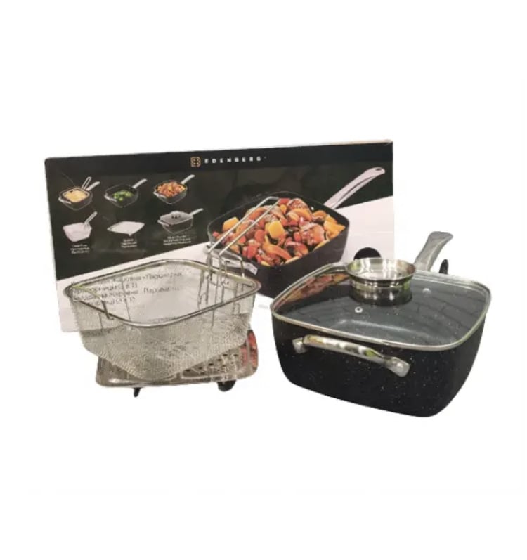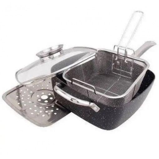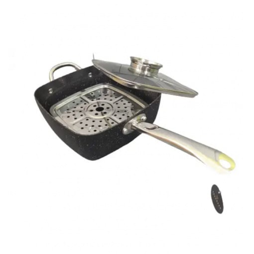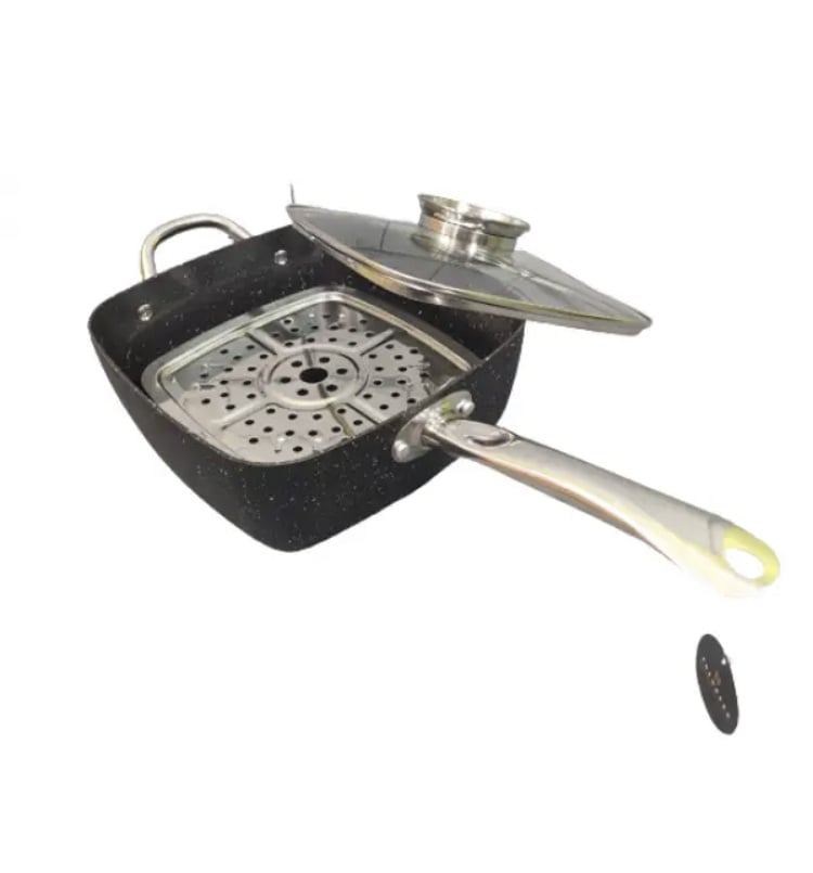 Высококачественная квадратная глубокая сковорода предназначена как сковорода, фритюрница, противень для выпечки, макароноварка и пароварка.