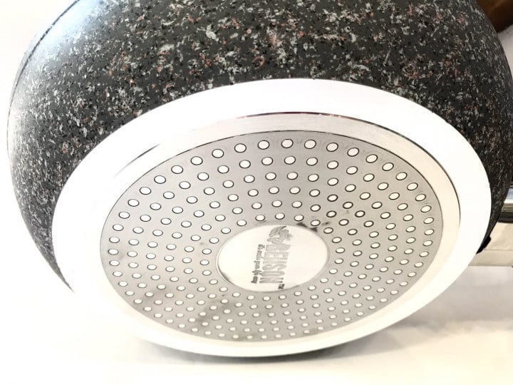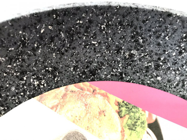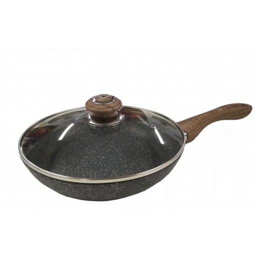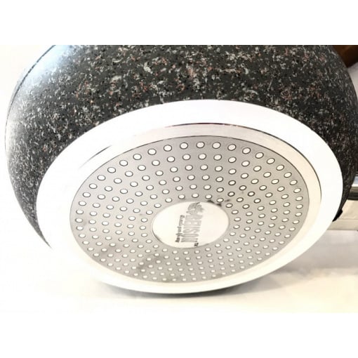 Сковорода изготовлена ​​из качественного литого алюминия, который характеризуется высокой теплопроводностью и имеет покрытие из гранитной крошки. Такая поверхность данного товара обеспечивает высокую прочность и долговечность и является антипригарной, устойчива к царапинам. Трехслойное покрытие улучшает качество приготовленной пищи, поскольку позволяет практически не использовать жиров. Наружная поверхность сковороды также покрыта гранитной крошкой. Эта посуда приспособлена для изготовления на всех современных типах плит, в т. ч. индукционных. С помощью удобной ручки с