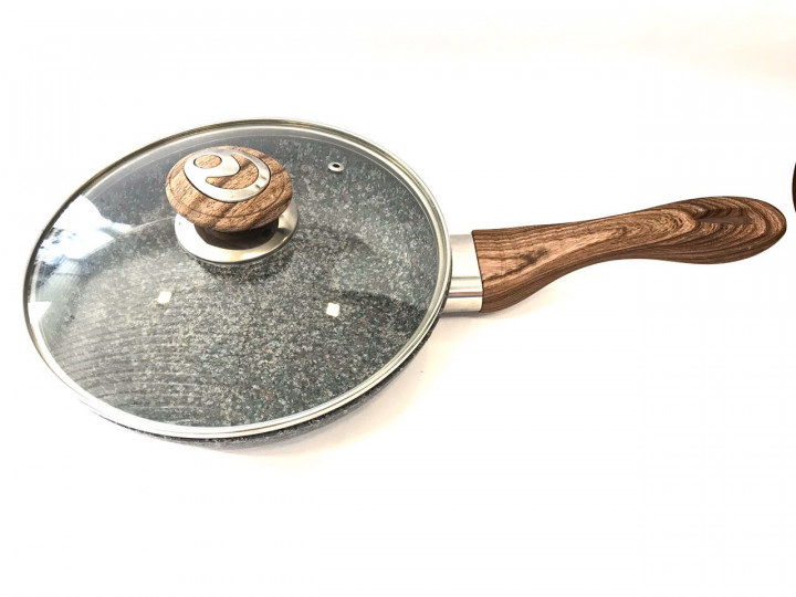 бакелита, сковороду можно безопасно перемещать. Стеклянная крышка выпуклой формы имеет ручку в тон ручки сковороды. Посуда легко моется в теплой воде с помощью мягкой губки. Имеет оригинальный вид.