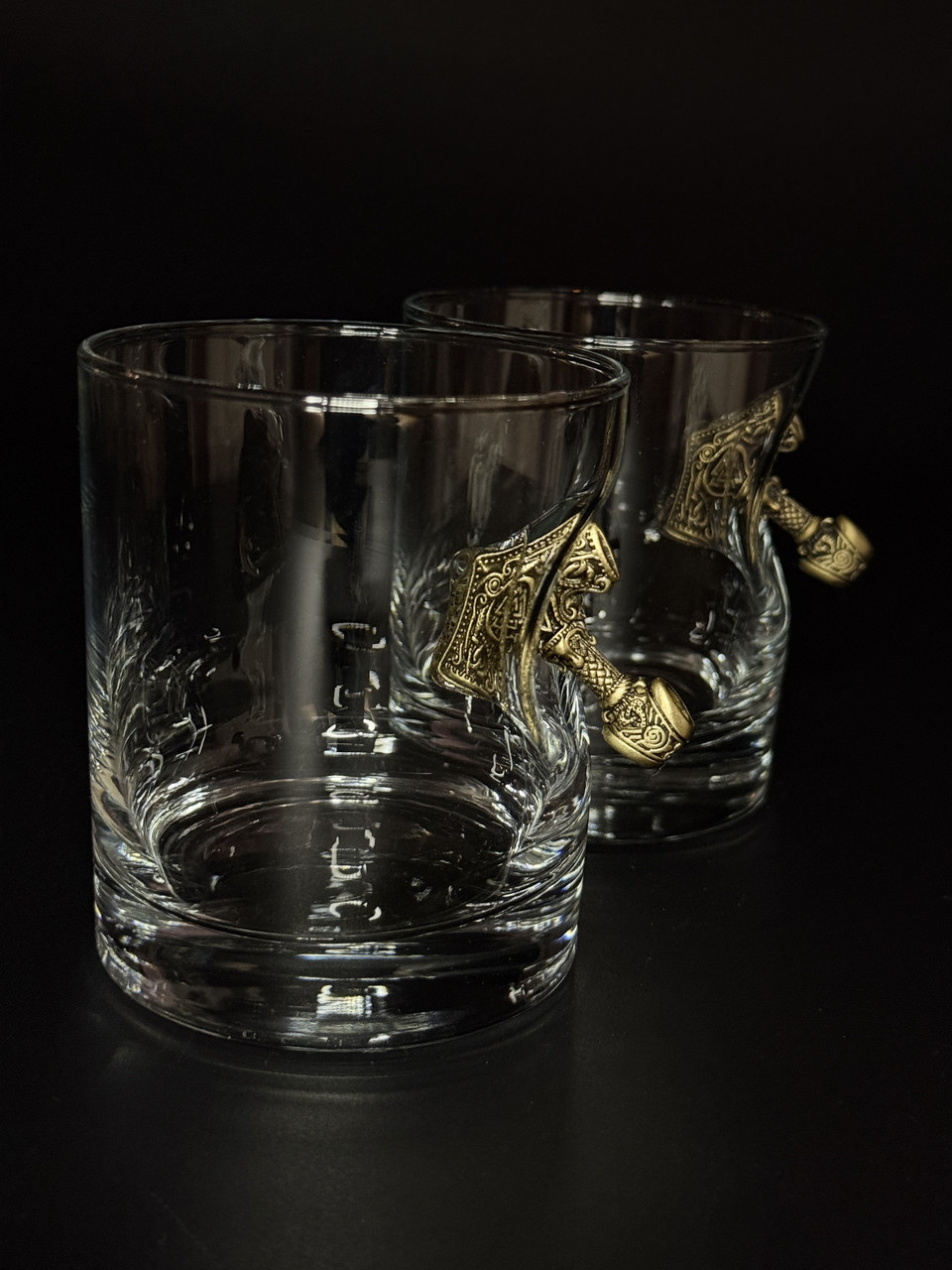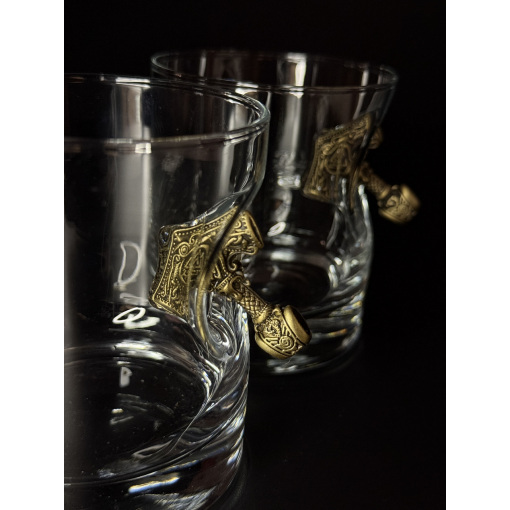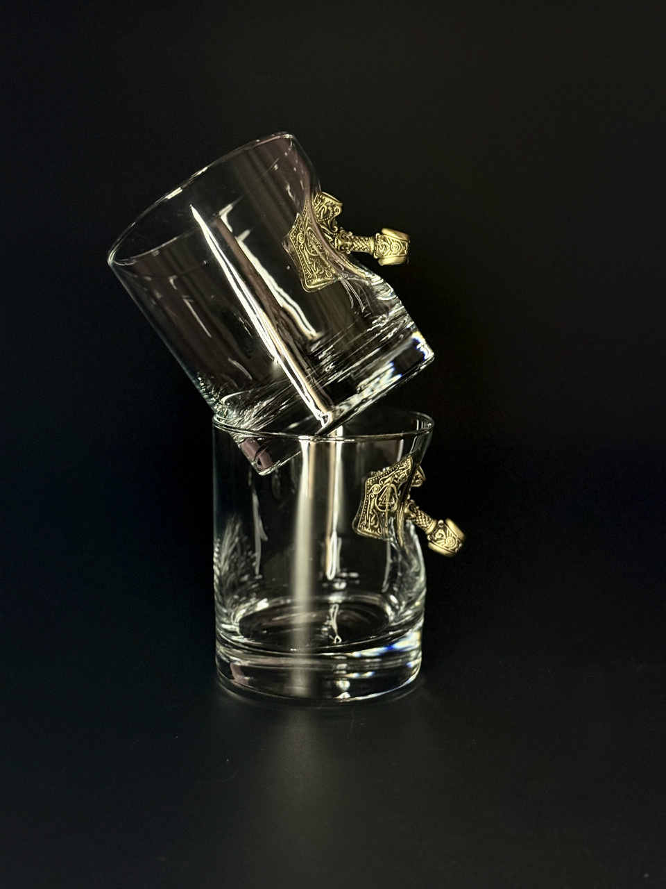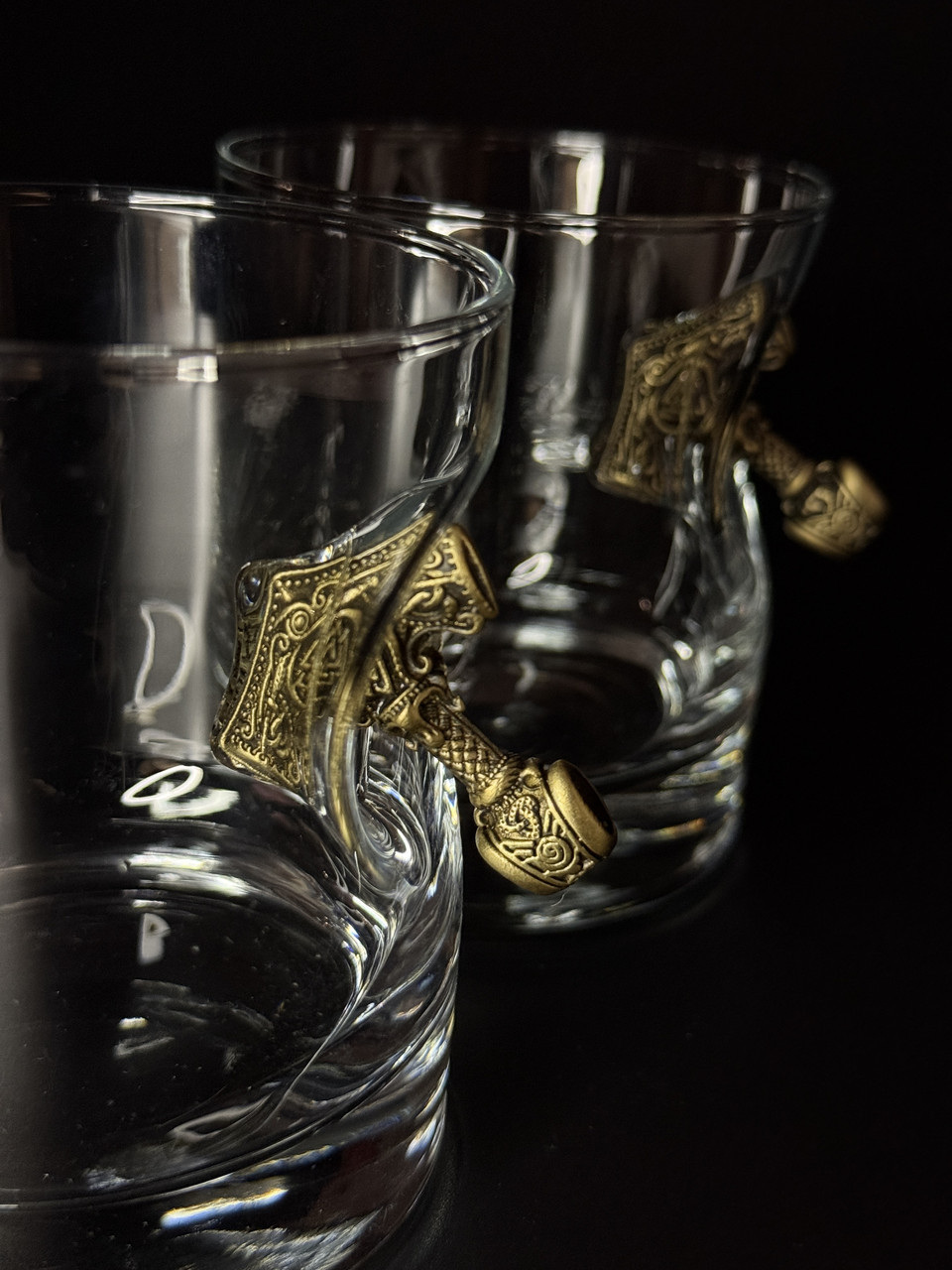 Изделие украшено изысканным металлическим элементом в виде молота Тора — символа силы и отваги в скандинавской мифологии. Каждый предмет выполнен из прочного стекла с объемной металлической вставкой, придающей изделию уникальный и брутальный внешний вид. Оригинальный дизайн делает набор не просто посудой, а настоящим предметом коллекции.