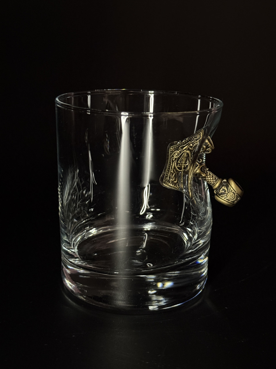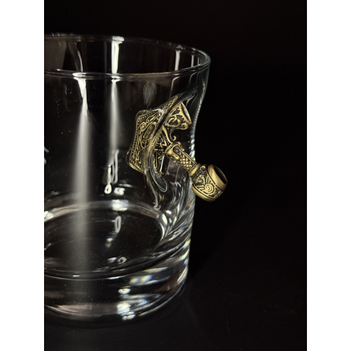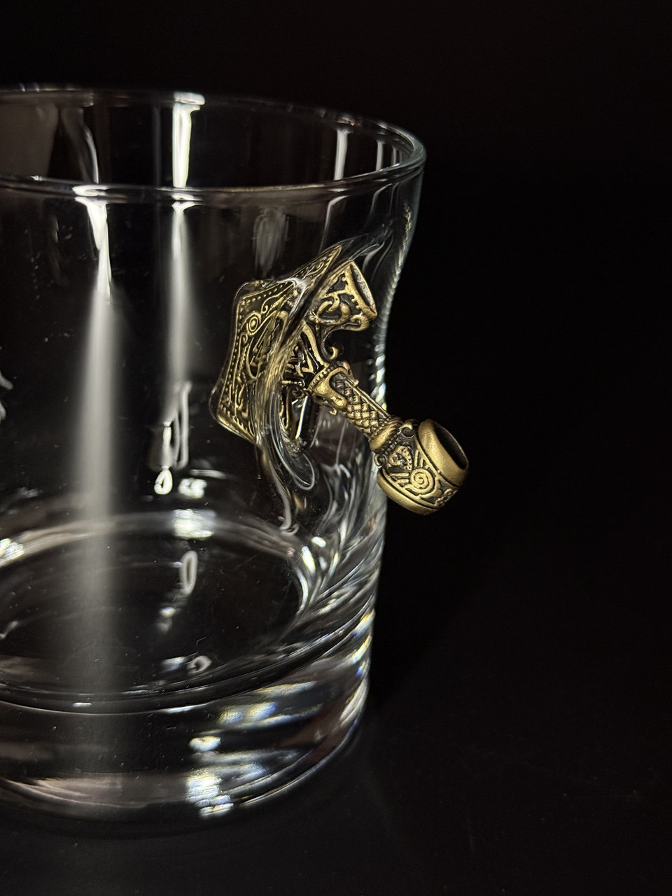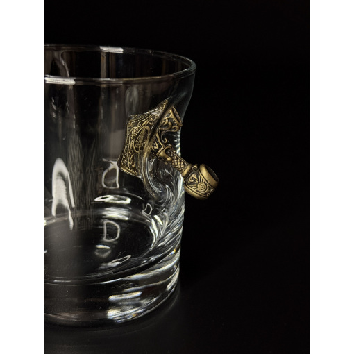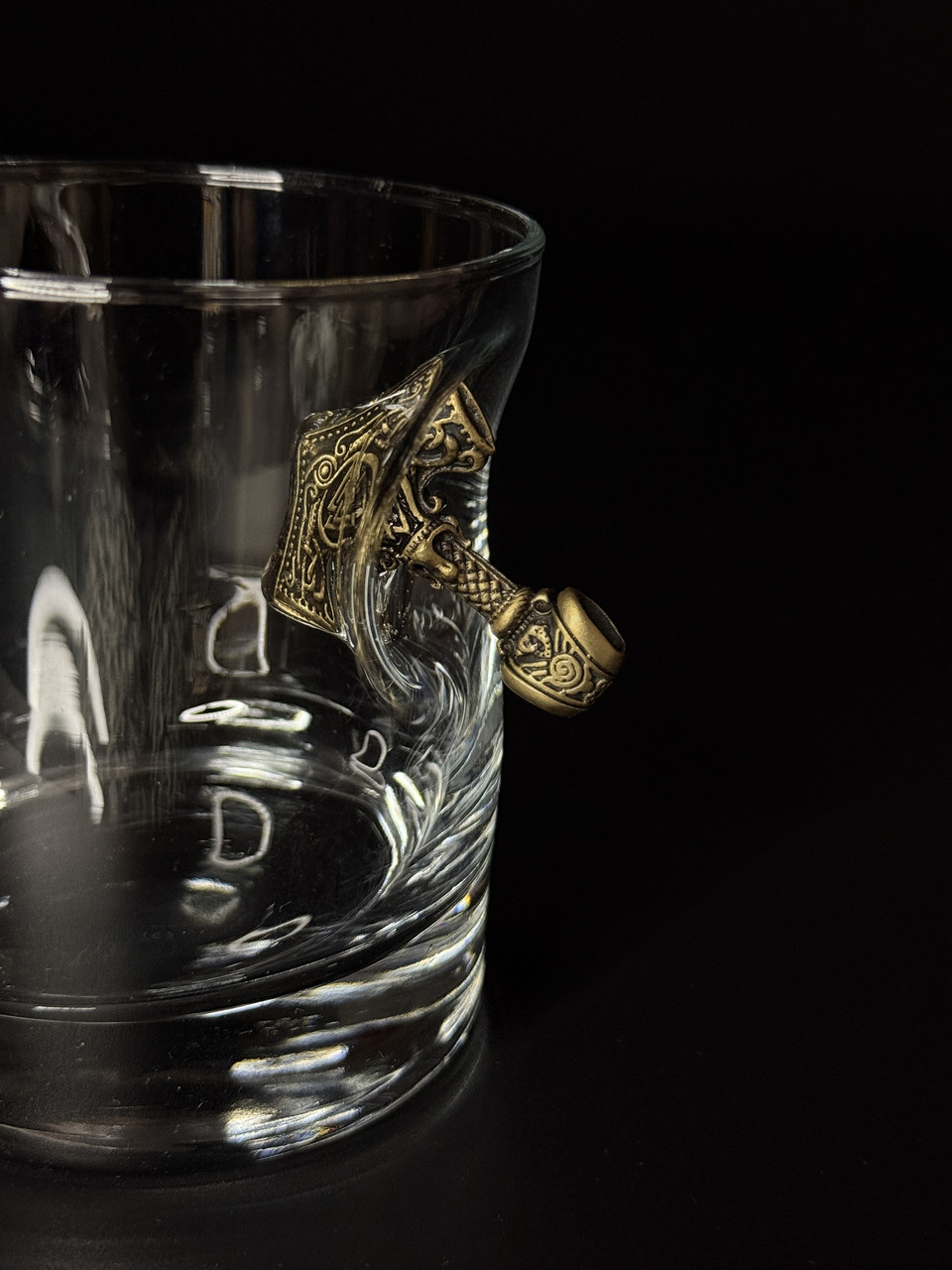 Изделие украшено изысканным металлическим элементом в виде молота Тора — символа силы и отваги в скандинавской мифологии. Каждый предмет выполнен из прочного стекла с объемной металлической вставкой, придающей изделию уникальный и брутальный внешний вид. Оригинальный дизайн делает набор не просто посудой, а настоящим предметом коллекции.
