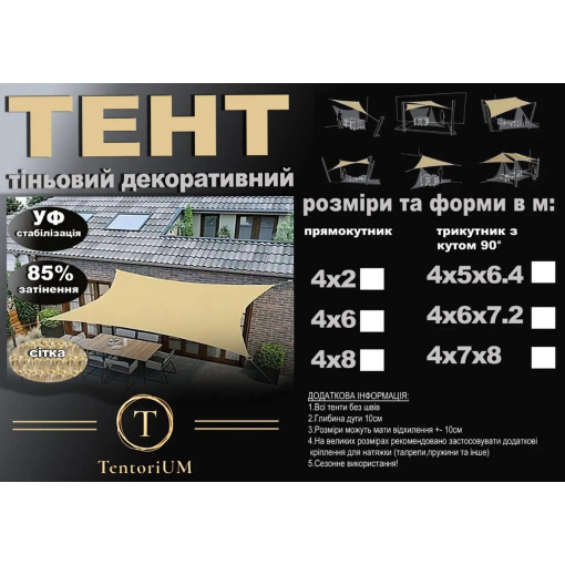 Тенты из сетки легкие, но прочные, при этом их легко снять и сложить до компактных размеров, что делает такой вариант удобным для переноски. Если вы ищете надежное и эффективное решение для создания тени, тенты Tentorium - правильный выбор!