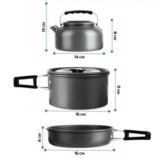 Туристический набор посуды для пикника  идеально подойдет во время похода. Комплект включает в себя кастрюлю, сковородку и чайник, которые изготовлены из импортного алюминиевого материала, устойчивого к высоким температурам и трению. Посуда отличается своей компактностью, портативностью и удобством переноски. Ручки на кастрюле, сковородке и чайнике можно сложить, чтобы сэкономить место в сумке или рюкзаке. Кроме этого, использовано антипригарное покрытие для легкой очистки и обеспечения длительного срока эксплуатации.