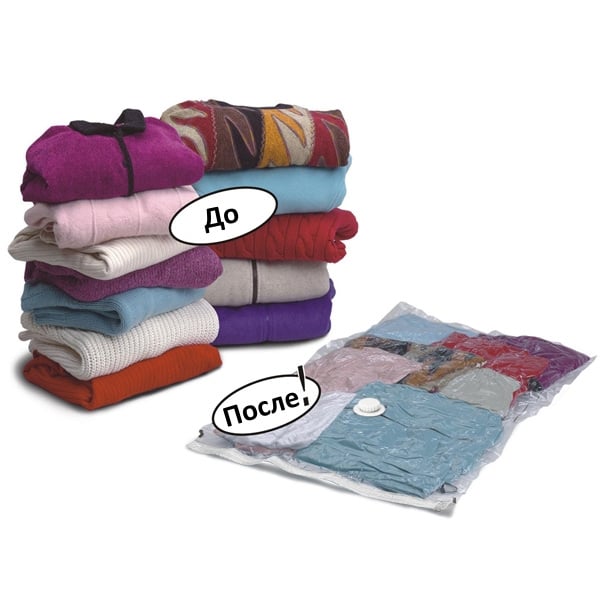 Не трудно догадаться, что этот самый вакуумный пакет - герметичная упаковка высокой прочности со специальным клапаном, который используется для сжатия одежды до их минимального объема.Почему для этих целей нельзя использовать обычный кулек, целлофановый пакет? Все просто.Во-первых, обычные упаковки зачастую недостаточно плотные (могут банально порваться). Во-вторых - отсутствие клапана, который плотно закрывает отверстие для пылесоса. Без него достать трубку, не надув пакет, весьма проблематично. В третьих, целлофан тоньше, чем ПВХ, так что может пропускать воздух сам материал.Материал ПВХ водо- и воздухонепроницаемый, соответственно одежда не промокнет и впитает никакой запах. Кстати, насекомые тоже не заведутся - они не обитают в безвоздушной среде.Как использовать вакуумный пакет?Сжимать одежду с помощью вакуумных упаковок легко и быстро. Для этого выполняем три шага: 1.Сложить всю необходимую одежду в пакет, закрыть молнию; 2.В специальный клапан вставить шланг от пылесоса; 3.Втянуть воздух пылесосом, закрыть клапан.Напоминаем, что чем объемнее одежда (пуховики, подушки и т. д.), тем меньше они станут. Плотные материалы с небольшим количеством воздуха стягиваются меньше (шуба, дубленка).