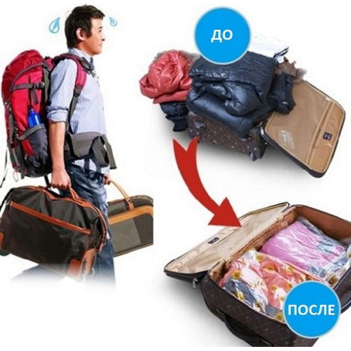 Не трудно догадаться, что этот самый вакуумный пакет - герметичная упаковка высокой прочности со специальным клапаном, который используется для сжатия одежды до их минимального объема.Почему для этих целей нельзя использовать обычный кулек, целлофановый пакет? Все просто.Во-первых, обычные упаковки зачастую недостаточно плотные (могут банально порваться). Во-вторых - отсутствие клапана, который плотно закрывает отверстие для пылесоса. Без него достать трубку, не надув пакет, весьма проблематично. В третьих, целлофан тоньше, чем ПВХ, так что может пропускать воздух сам материал.Материал ПВХ водо- и воздухонепроницаемый, соответственно одежда не промокнет и впитает никакой запах. Кстати, насекомые тоже не заведутся - они не обитают в безвоздушной среде.Как использовать вакуумный пакет?Сжимать одежду с помощью вакуумных упаковок легко и быстро. Для этого выполняем три шага: 1.Сложить всю необходимую одежду в пакет, закрыть молнию; 2.В специальный клапан вставить шланг от пылесоса; 3.Втянуть воздух пылесосом, закрыть клапан.Напоминаем, что чем объемнее одежда (пуховики, подушки и т. д.), тем меньше они станут. Плотные материалы с небольшим количеством воздуха стягиваются меньше (шуба, дубленка).