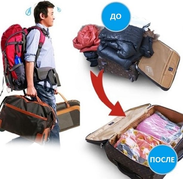 Не трудно догадаться, что этот самый вакуумный пакет - герметичная упаковка высокой прочности со специальным клапаном, который используется для сжатия одежды до их минимального объема.Почему для этих целей нельзя использовать обычный кулек, целлофановый пакет? Все просто.Во-первых, обычные упаковки зачастую недостаточно плотные (могут банально порваться). Во-вторых - отсутствие клапана, который плотно закрывает отверстие для пылесоса. Без него достать трубку, не надув пакет, весьма проблематично. В третьих, целлофан тоньше, чем ПВХ, так что может пропускать воздух сам материал.Материал ПВХ водо- и воздухонепроницаемый, соответственно одежда не промокнет и впитает никакой запах. Кстати, насекомые тоже не заведутся - они не обитают в безвоздушной среде.Как использовать вакуумный пакет?Сжимать одежду с помощью вакуумных упаковок легко и быстро. Для этого выполняем три шага: 1.Сложить всю необходимую одежду в пакет, закрыть молнию; 2.В специальный клапан вставить шланг от пылесоса; 3.Втянуть воздух пылесосом, закрыть клапан.Напоминаем, что чем объемнее одежда (пуховики, подушки и т. д.), тем меньше они станут. Плотные материалы с небольшим количеством воздуха стягиваются меньше (шуба, дубленка).
