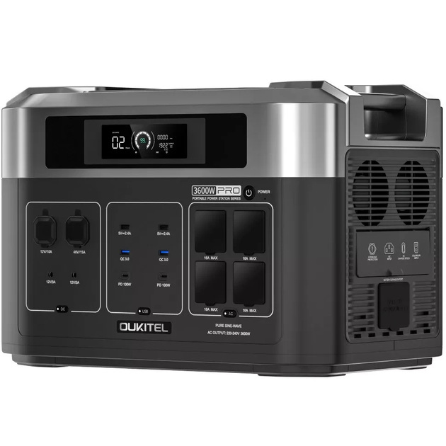 Портативная зарядная станция OUKITEL BP2000 PRO - это более мощная версия стандартной BP2000 с функцией ИБП, номинальной мощностью 3600 Вт и пиковой мощностью 7200 Вт, работает на выходном напряжении 200-240 В и генерирует чистую синусоиду.