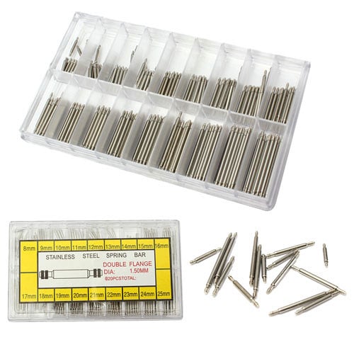 Большой набор металлических штифтов для браслетов наручных часов различных размеров, длиной от 8 до 25 мм. Подойдут для ремешков и браслетов из любых материалов: металл, пластик, кожа или дерево. Подпружиненные с обеих сторон шпильки устанавливаются в отверстия в ушках наручных часов удерживая ремешок. По краям штифтов есть по два кольцевых выступа (на штифтах длиной 8 и 9 мм выступ только один). Тот, что ближе к краю, фиксирует штифт в отверстии, второй используется для поддевания штифта инструментом, когда нужно его вынуть.