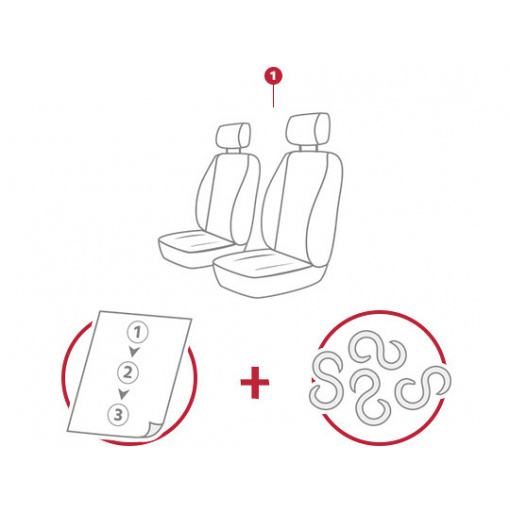 Комплектация включает в себя 2 майки для передних сидений и монтажные крючки, что позволяет легко установить их на сиденье автомобиля.