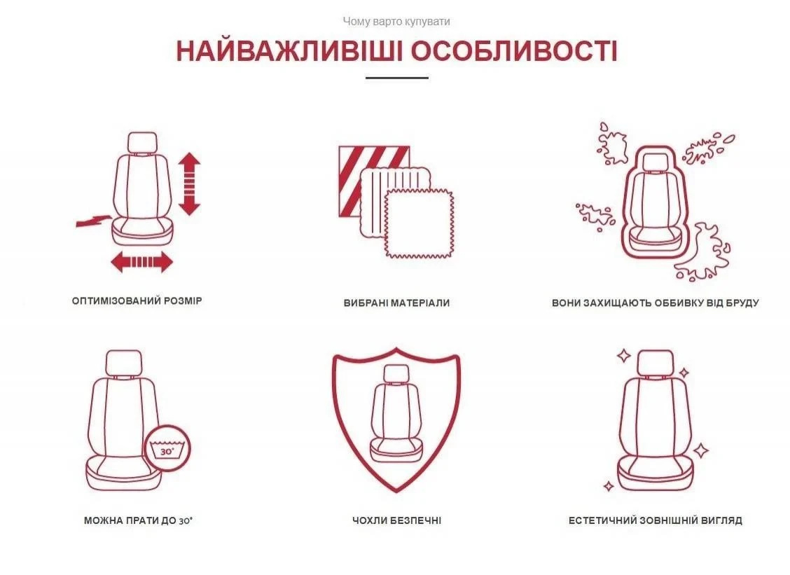 В комплекте с накидками на передние сиденья входят монтажные крючки, благодаря которым монтаж займет всего 5-10 минут, что делает процесс установки максимально простым и удобным.