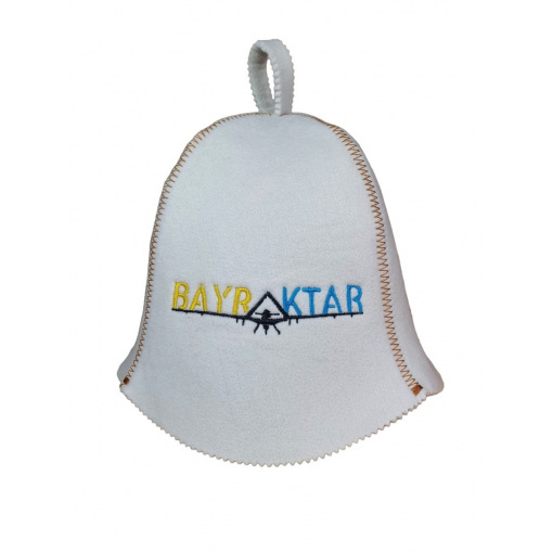 Банная шапка с вышивкой "Bayraktar" изготовлена из искусственного фетра. Цвет фетра белый.