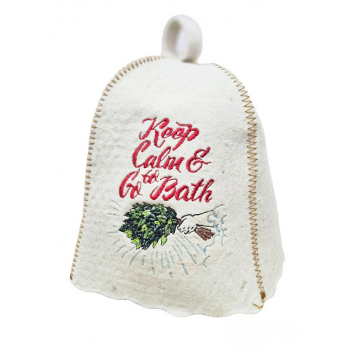 Банная шапка с вышивкой "Keep calm to go bath" изготовлена из натурального войлока, в составе которого овечья шерсть. Цвет белый.