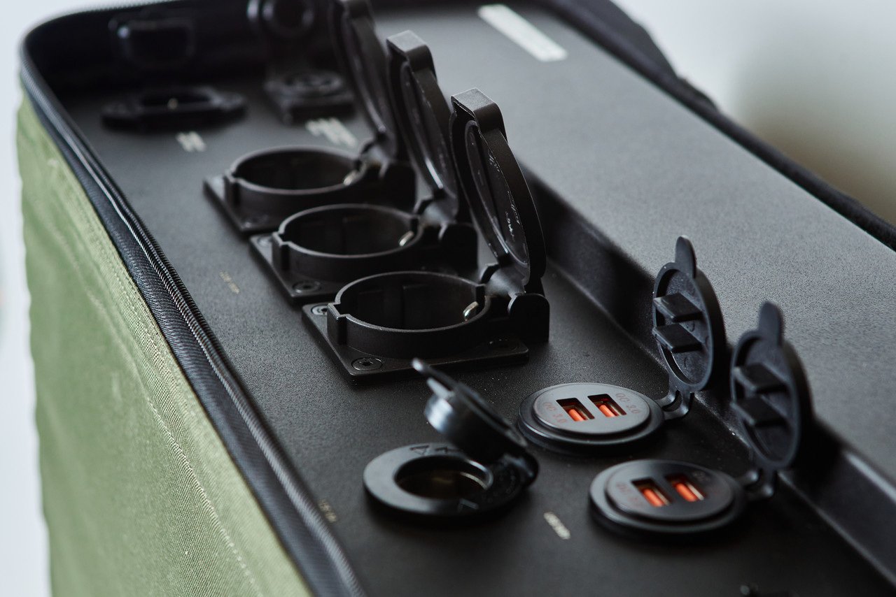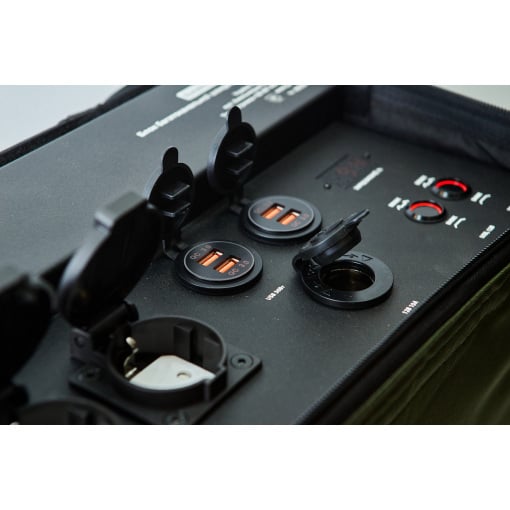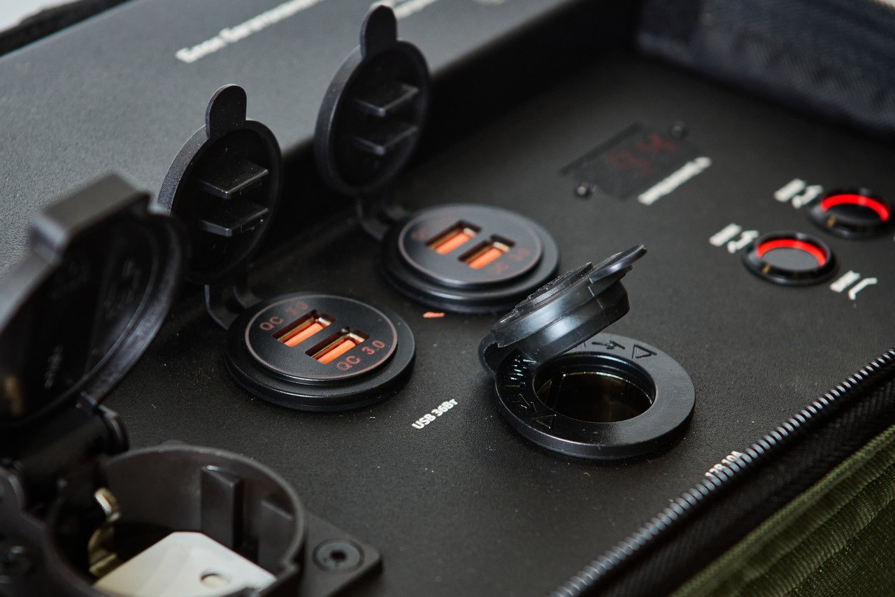 В верхней части станции размещены разъемы, включая зарядный разъем от солнечного модуляавтомобильную розетку 12В3 розетки 220В на мощность 1 кВт и 4 порта USB Quick Charge.