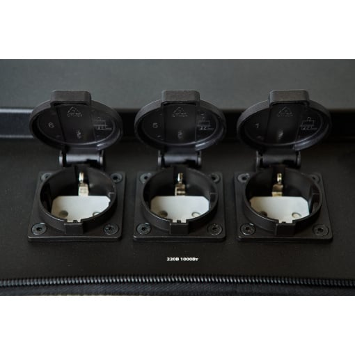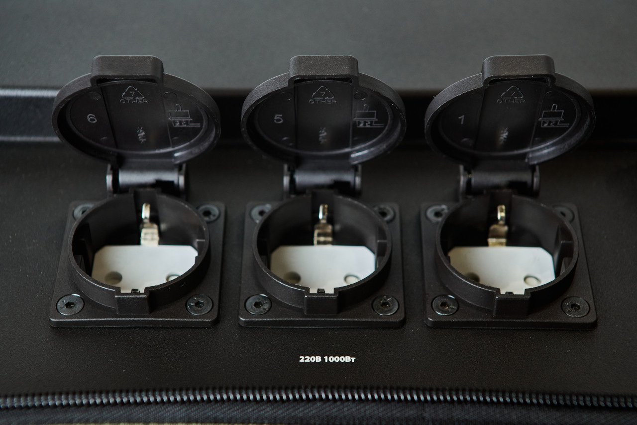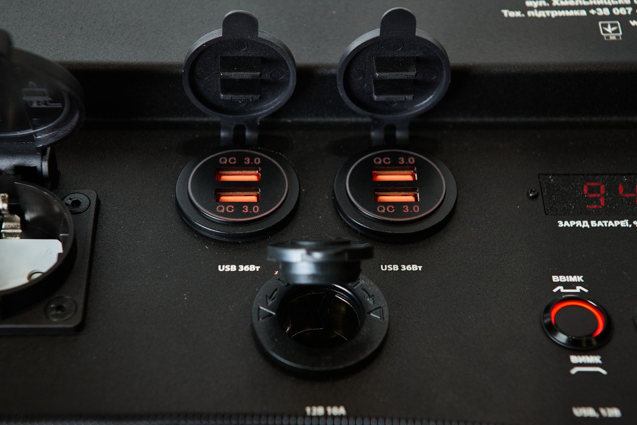 На верхней части устройства находятся 1 разъем для зарядки от солнечного модуля, 1 автомобильная розетка на 12 В, 3 розетки на 220В мощностью 1кВт, 4 порта USB Quick Charge.