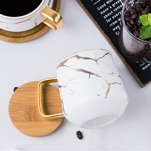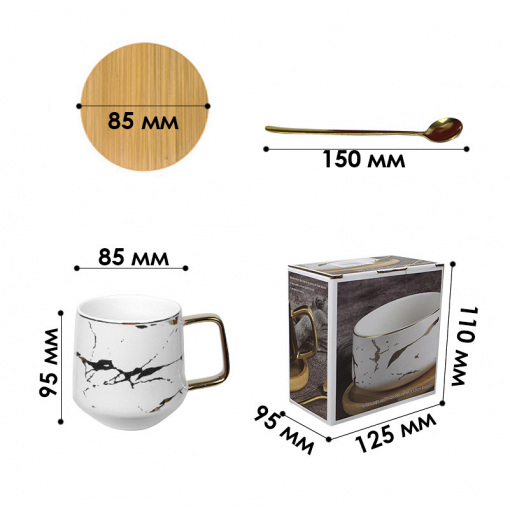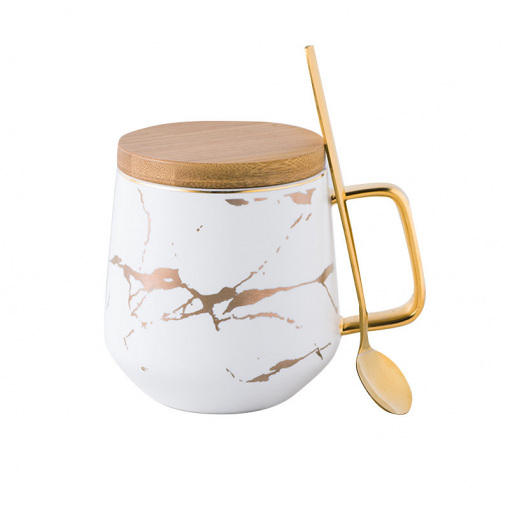 Чайная чашка No Brand B2024 White мраморная 400 мл с бамбуковой крышкой